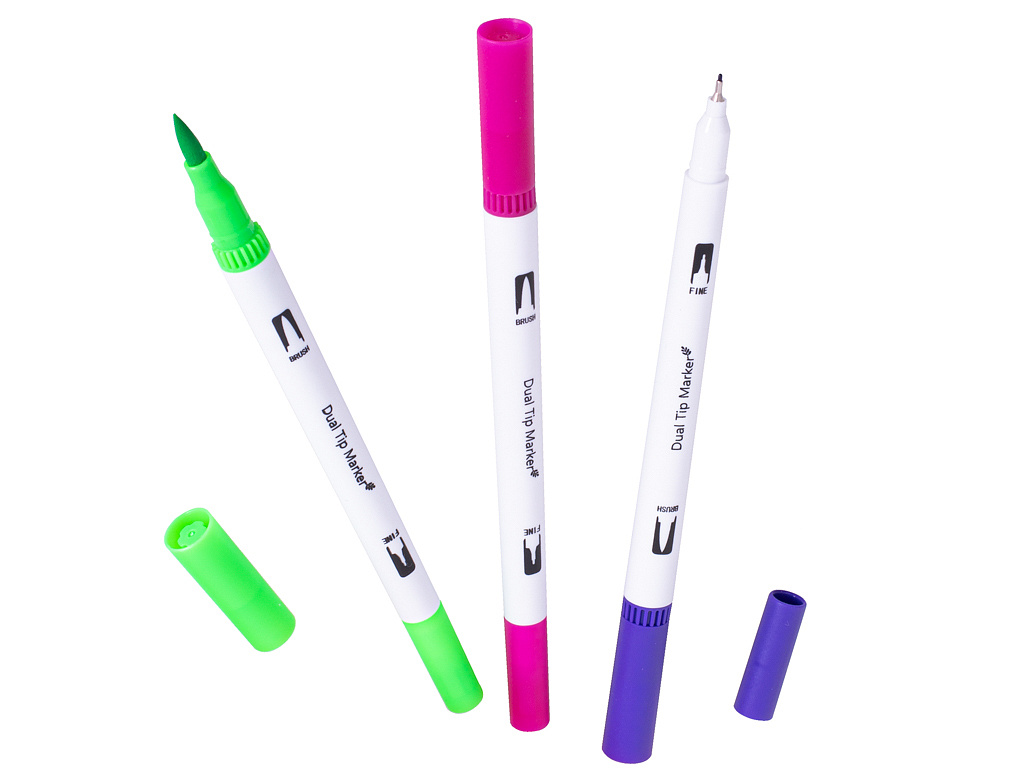 Każdy z pisaków posiada dwie końcówki na dwóch końcach – z jednej strony znajduje się cienkopis o szerokości 0.4 mm, pozwalający na precyzyjne tworzenie konturów oraz pisanie, a z drugiej mazak o szerokości 1 – 2 mm, którym błyskawicznie pokryjesz duże połacie kartki!
