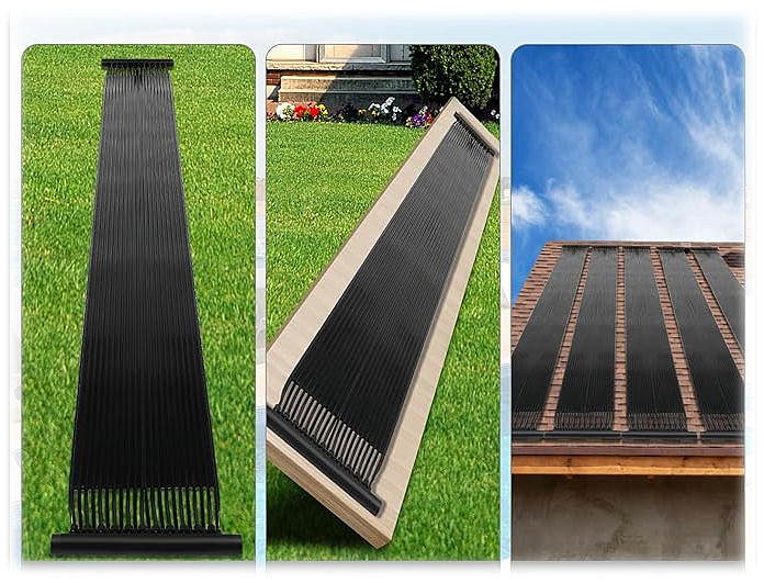Připravená sada solárního kolektoru o rozměrech 0,6 x 3,66 m.Lze jej umístit na zem, plot nebo střechu.