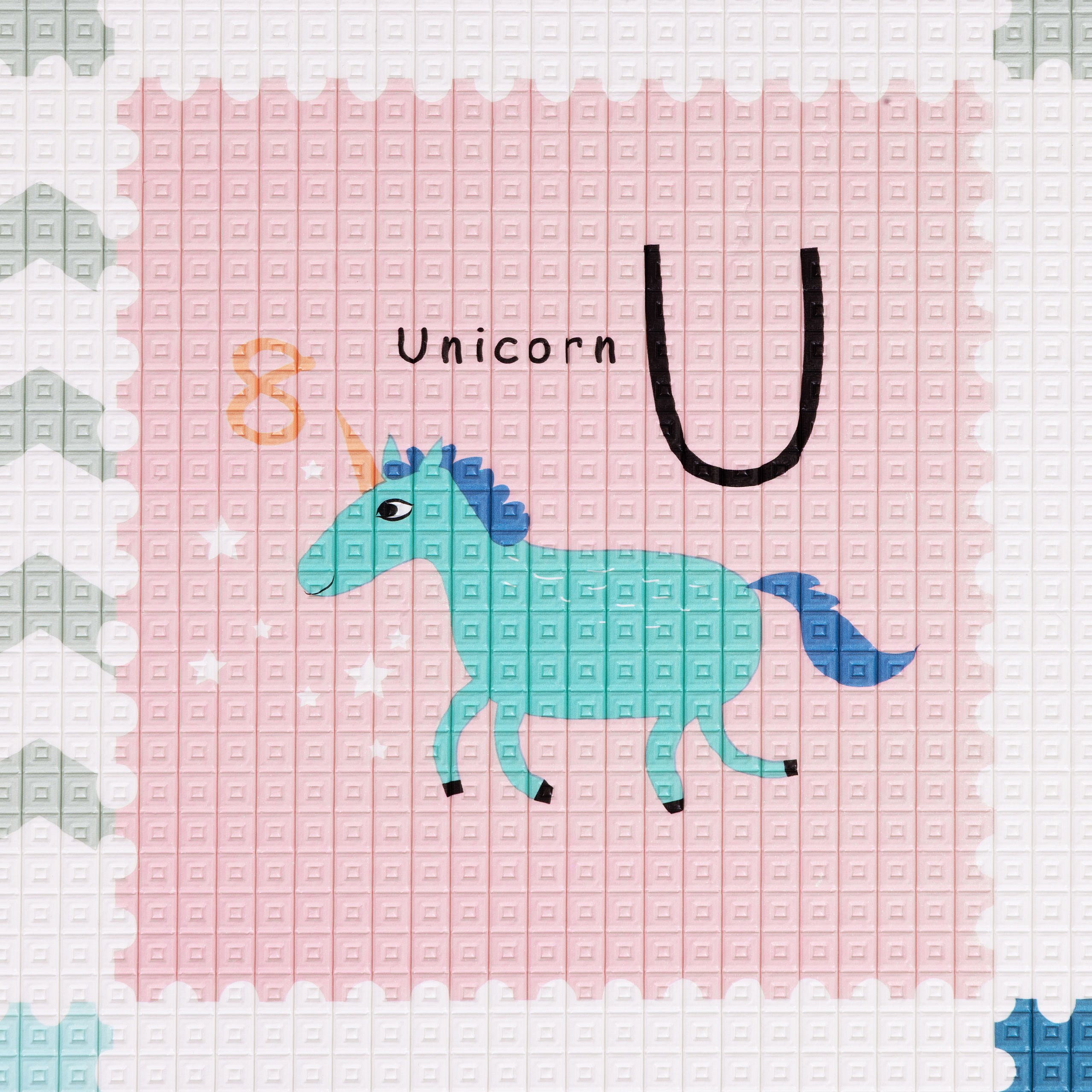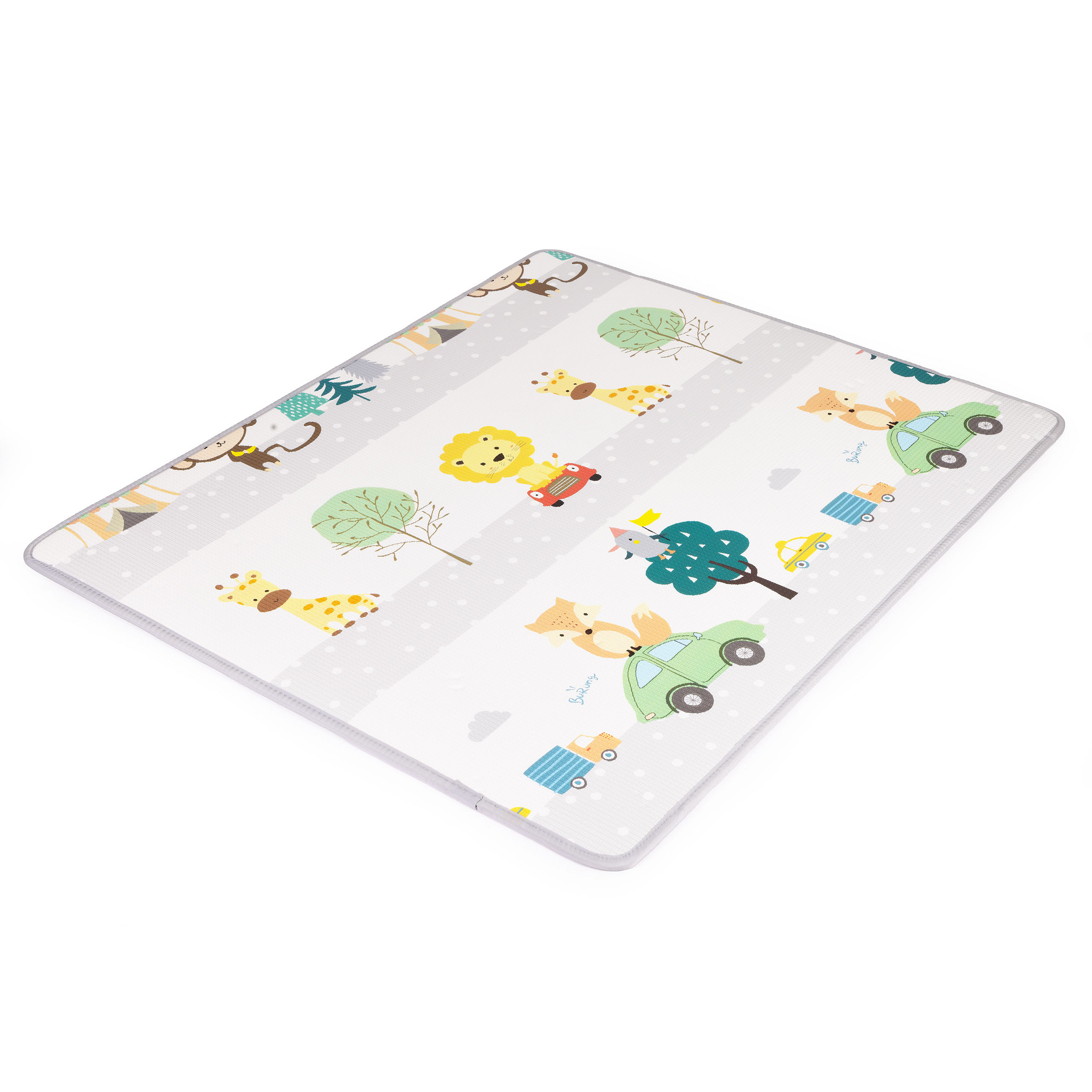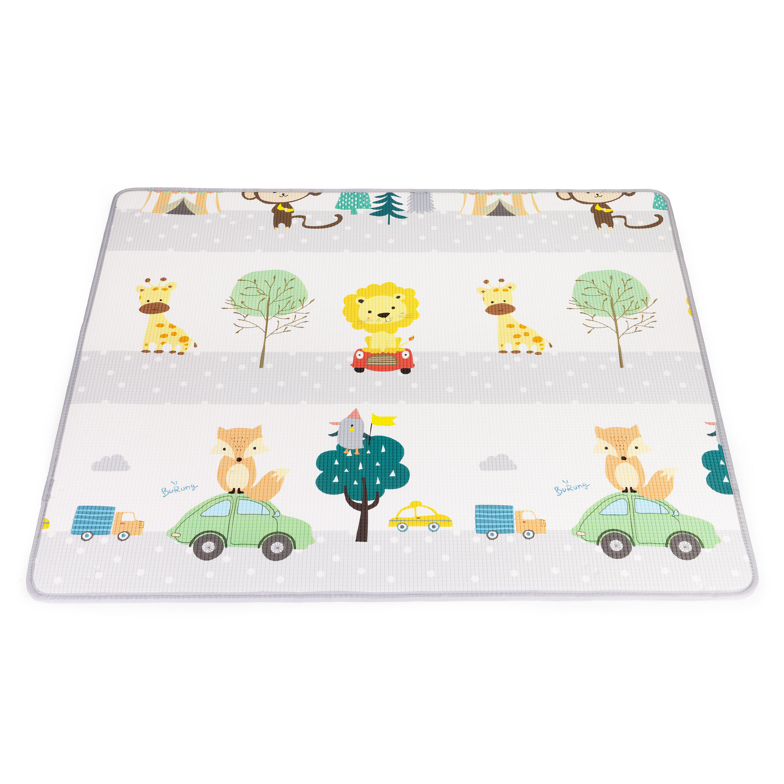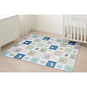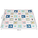 The mat is double-sided, giving children double the fun and learning opportunities. One side features a cheerful, educational alphabet board, with each letter paired with a colorful picture and English word – perfect for learning through play. The other side is decorated with illustrations of animals, vehicles, and nature, creating a warm and engaging space for daily fun. Soft colors and cute characters stimulate imagination and bring a cozy atmosphere to any child’s room.