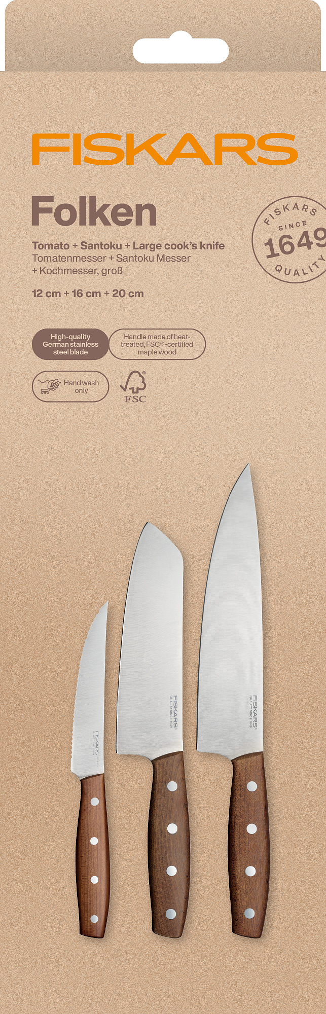 S Fiskars Folken sadou 3 nožů (1075689) získáte praktickou kombinaci nožů pro každodenní vaření, které spojují preciznost, odolnost a udržitelný design díky použití FSC certifikovaného dřeva.