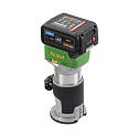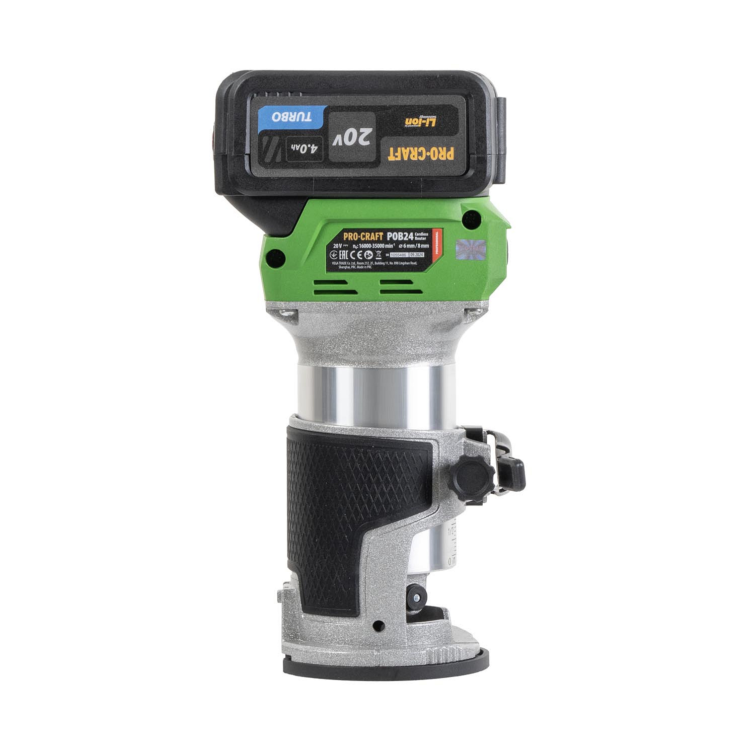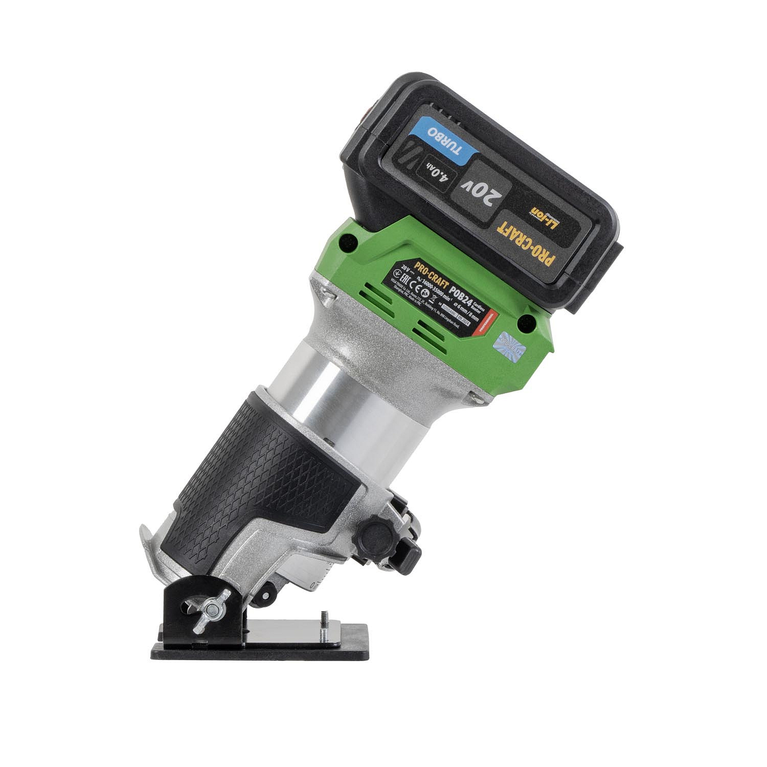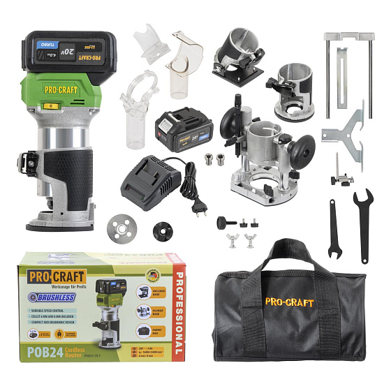Aku horní frézka Procraft POB24 – výkonný stroj s bezuhlíkovým motorem, regulací otáček (16 000–35 000 ot./min) a kleštinami 6/8 mm. Součástí balení je podélný doraz, tři základny, baterie 20V 4Ah, nabíječka a příslušenství. Hmotnost: 2 kg.