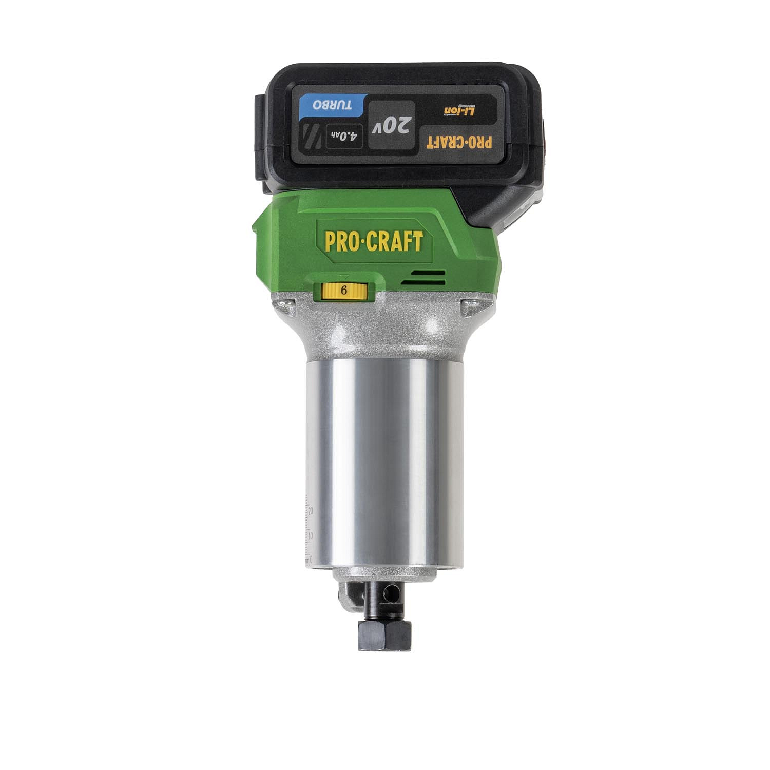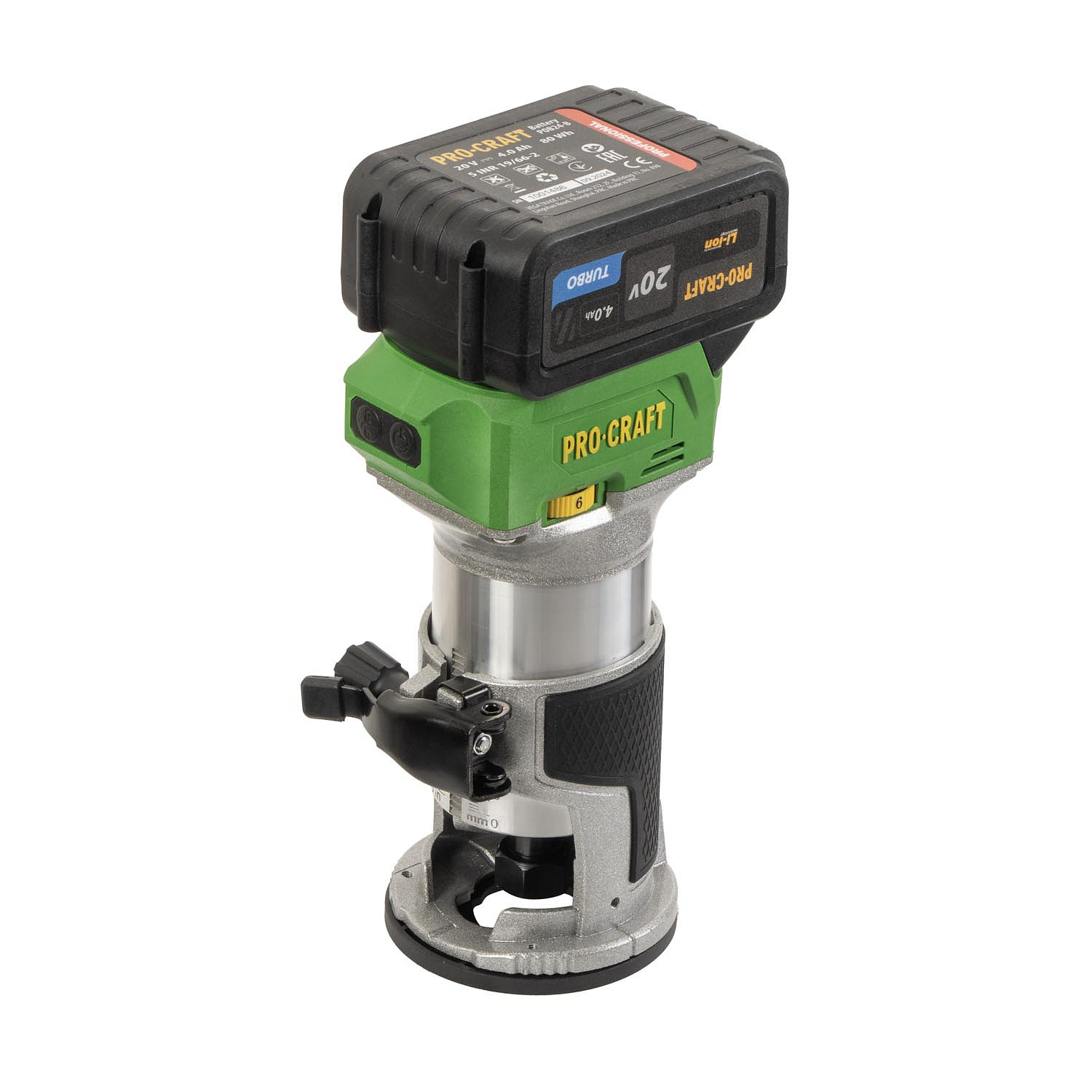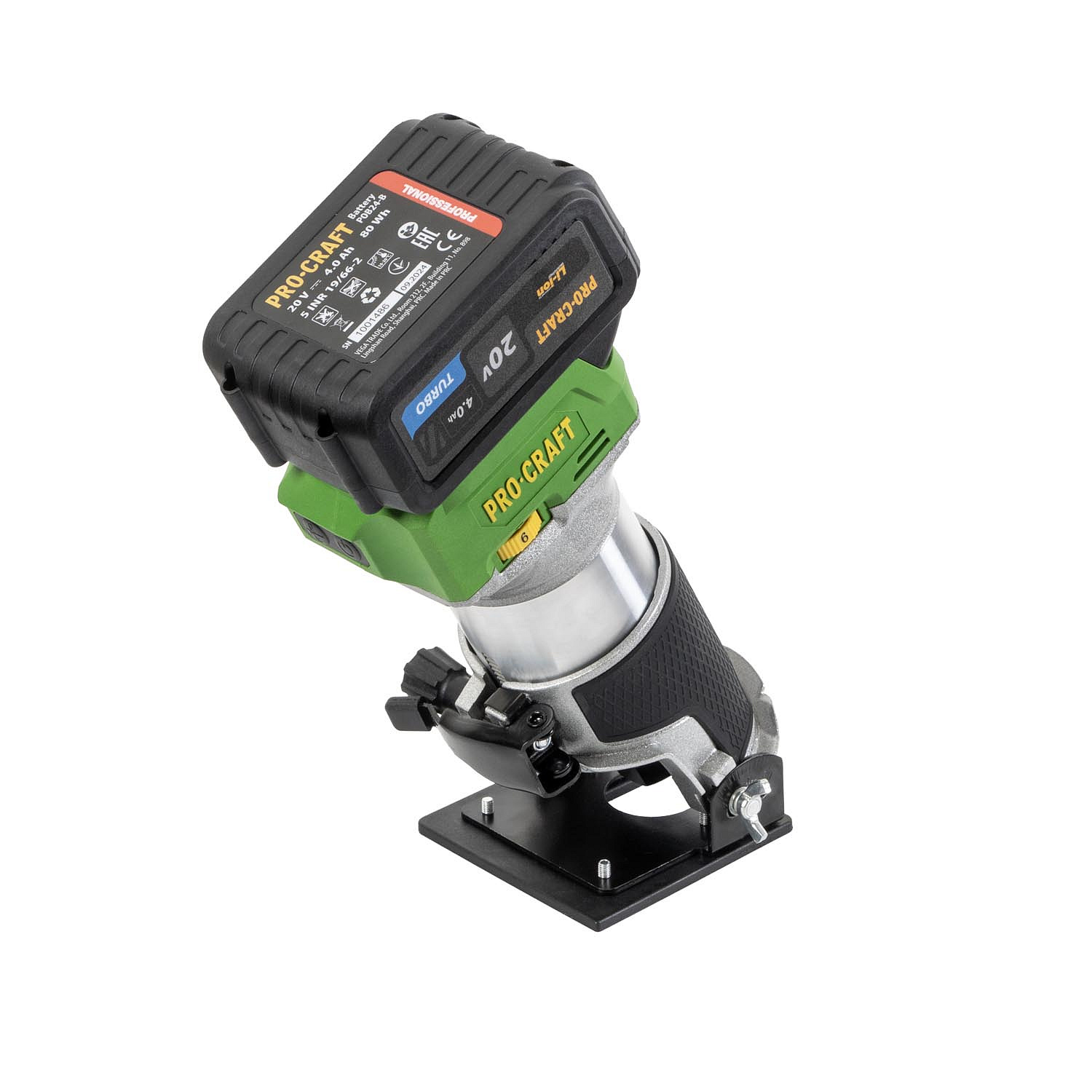 Aku horní frézka Procraft POB24 – výkonný stroj s bezuhlíkovým motorem, regulací otáček (16 000–35 000 ot./min) a kleštinami 6/8 mm. Součástí balení je podélný doraz, tři základny, baterie 20V 4Ah, nabíječka a příslušenství. Hmotnost: 2 kg.