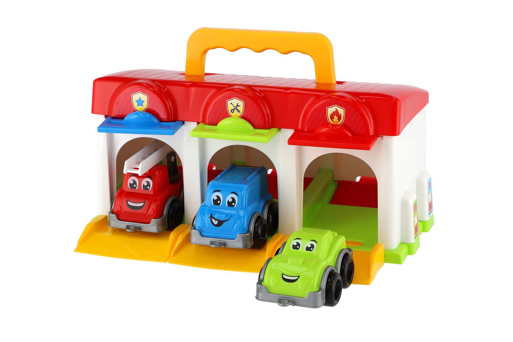 Potřebuješ mít autíčka stále při ruce a v bezpečí? Tato garáž s autíčky a praktickým držátkem je ta pravá! Pod třemi dveřmi se schovávají tři auta - hasiči, osobák a dodávka. V garáži najdete část pro snadnější vjezd a výjezd aut do své kóje. S těmito plastovými autíčky s garáží si užiješ mnoho zábavy! Rozměr krabice: 27 x 14 x 15 cm Vhodné pro děti od 3 let