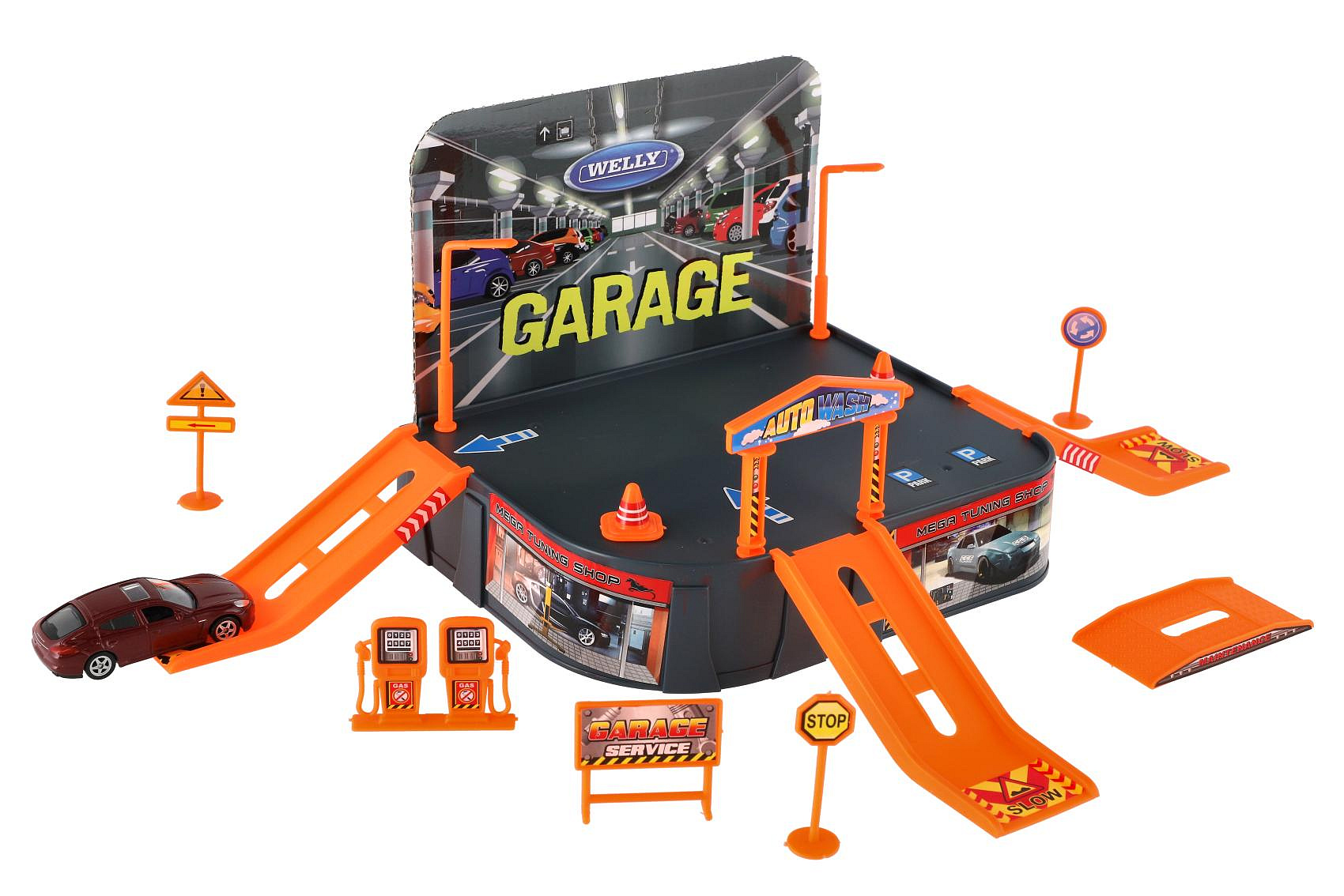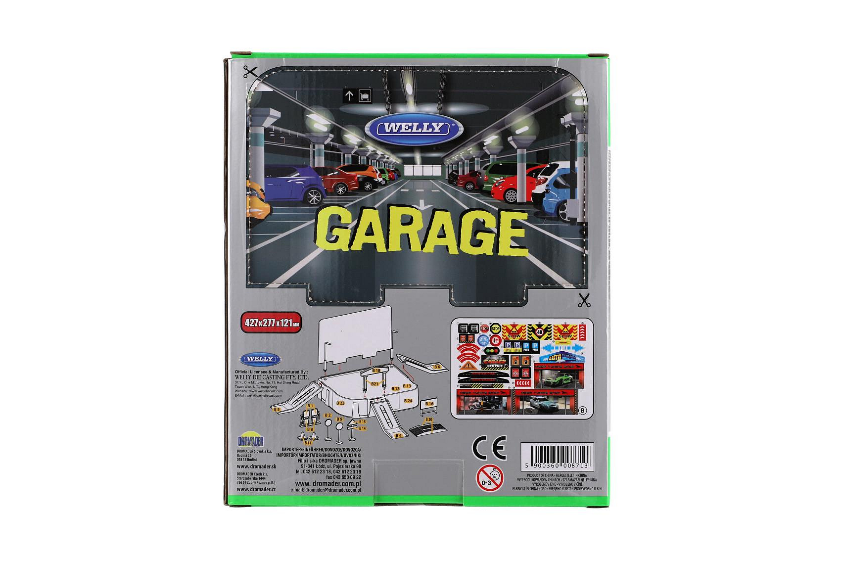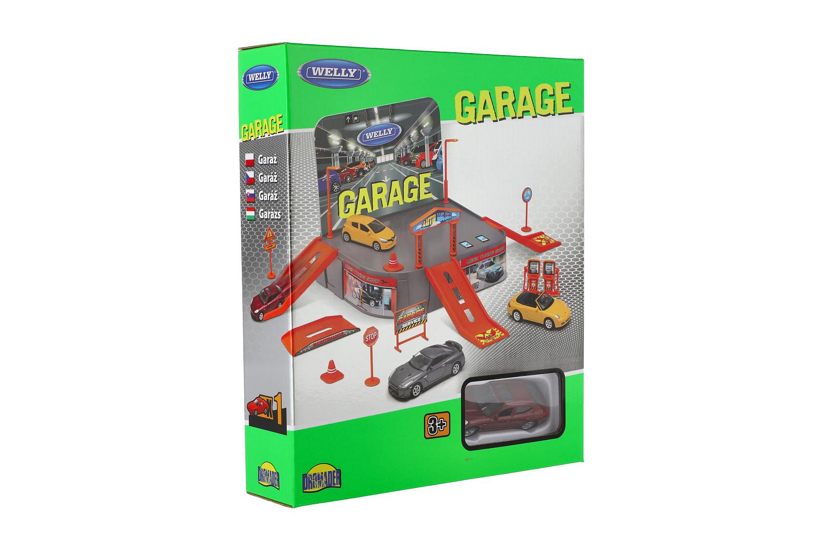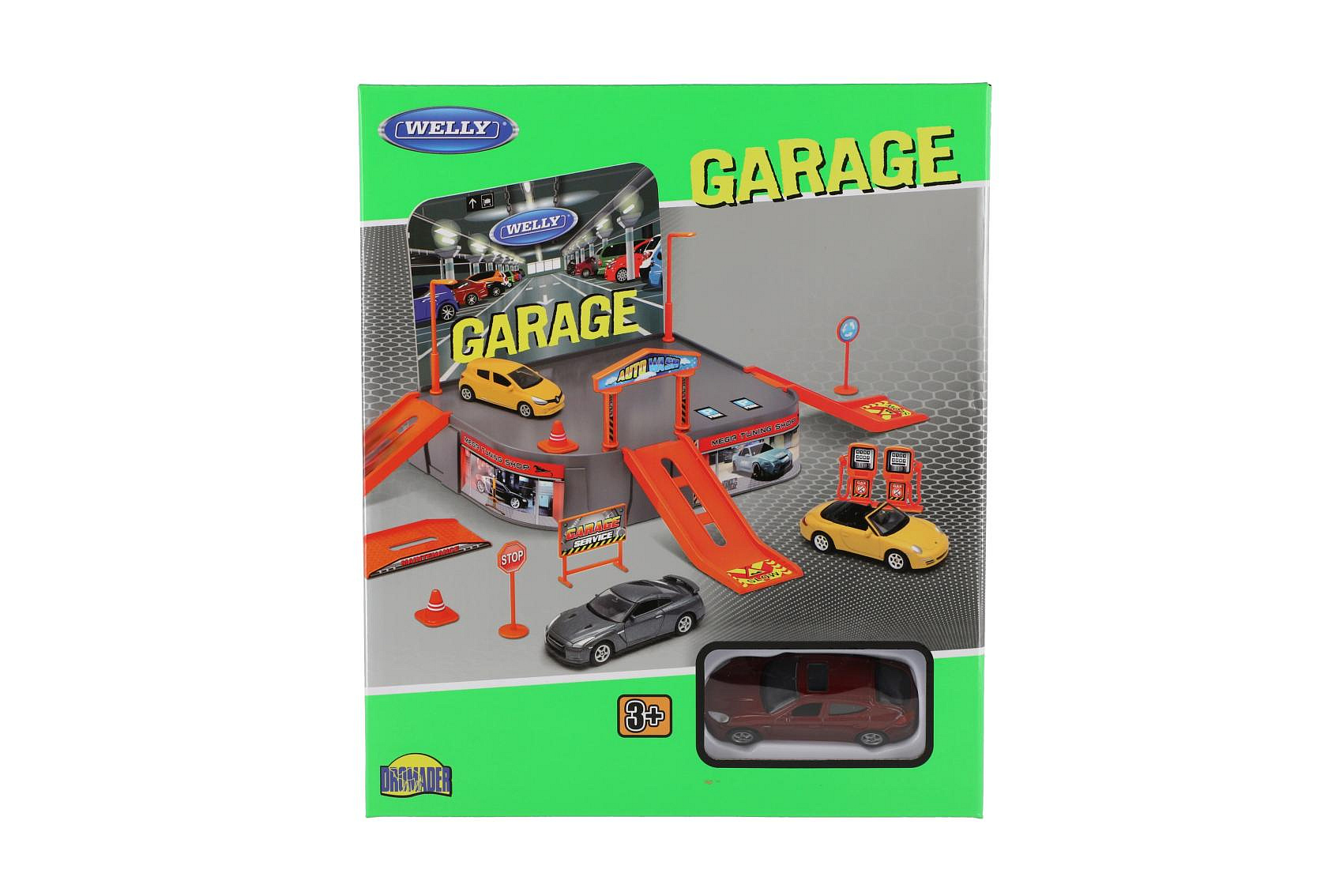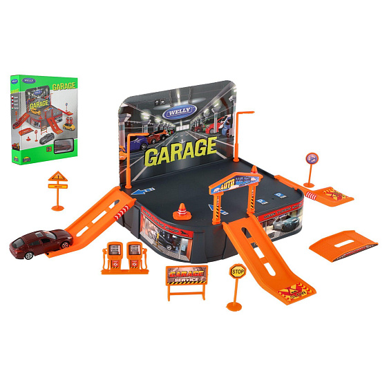 Nemá kam Váš řidič zaparkovat svá autíčka? Pořiďte mu tuto garáž a už nebudete mít problém se zaparkováním. Balení obsahuje skládací garáž, tankovací pumpu, nájezdy, značky... Všechny díly si polepí samolepkami, které jsou součástí balení. Balení obsahuje i auto Welly Porsche. Rozměr krabice: 21 x 25 x 5,5 cm Vhodné od 3 let