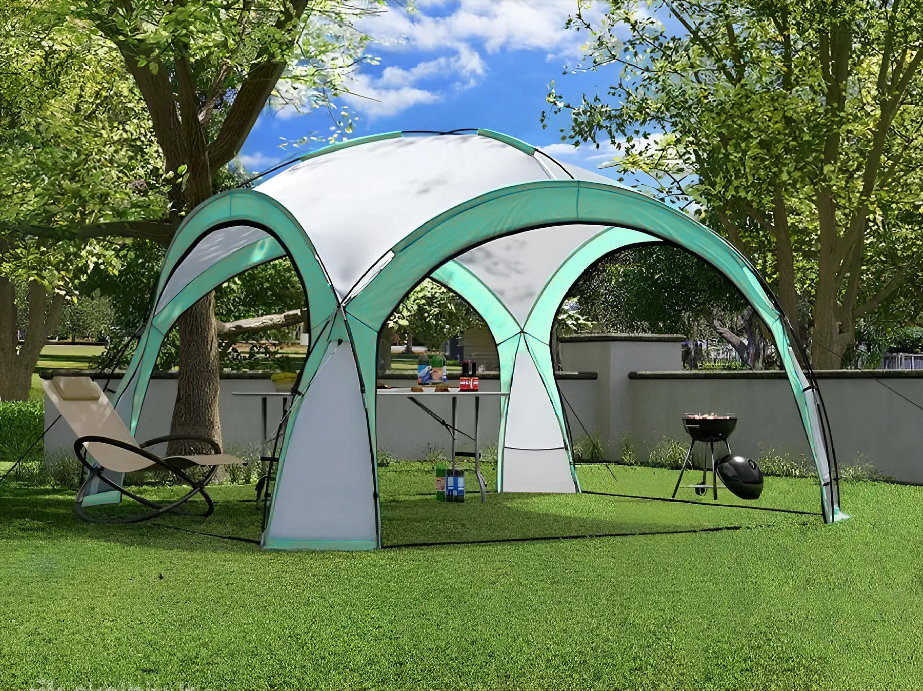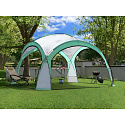 Thanks to its elegant look and the use of durable, solid materials, the tent works well not only in home gardens but also in restaurant outdoor areas or during open-air events. The pavilion frame is made of cross-connected fiberglass tubes, making it lightweight and sturdy. The canopy is made from weather-resistant polyester fabric (190 g/m²) in an elegant white-and-green color. The tent is designed so that rainwater runs off to the sides, while the open structure provides pleasant air circulation.