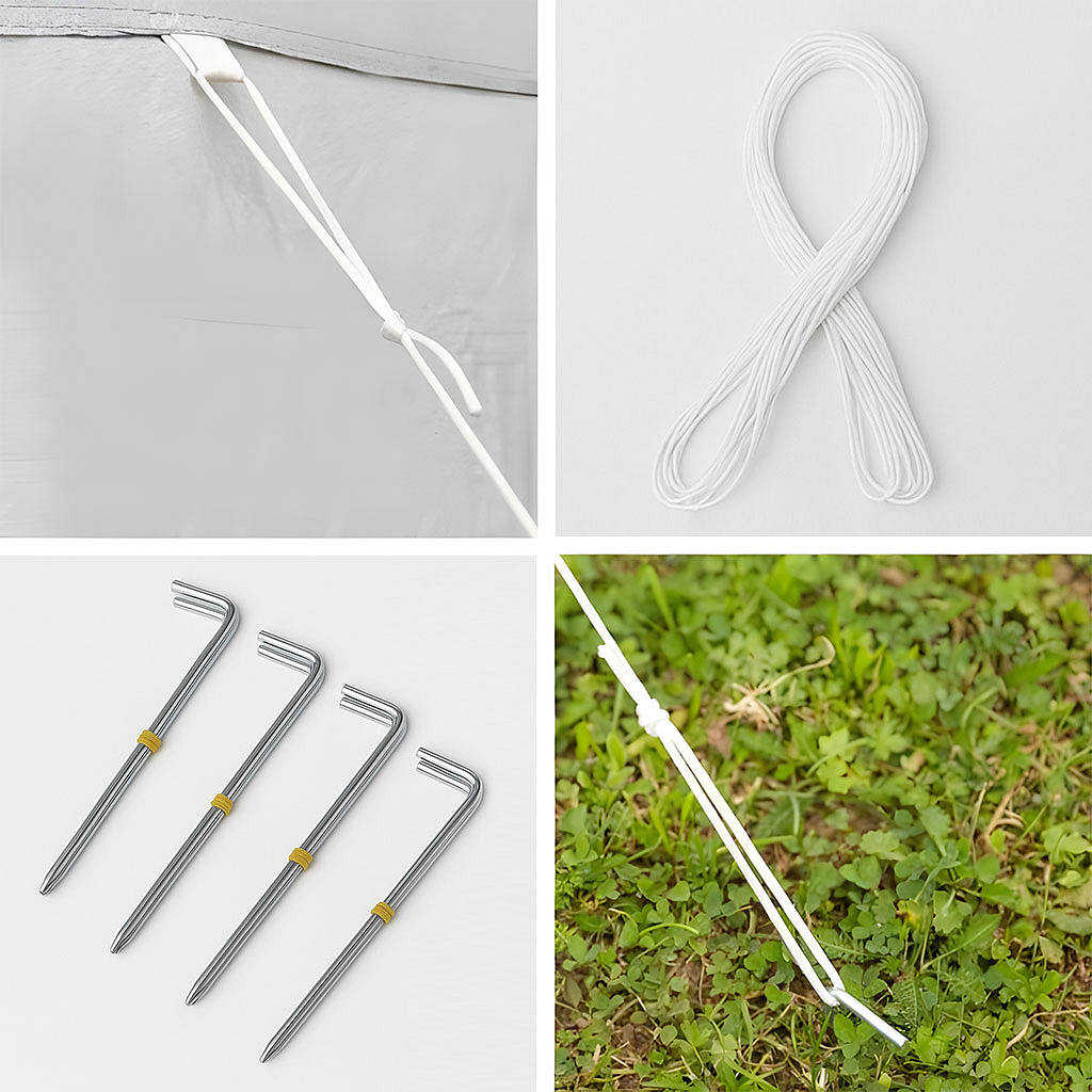 • Each tent leg is equipped with holes allowing it to be secured to the ground with stakes. Additionally, the use of guy ropes helps properly stabilize the entire structure, protecting it from shifting or tipping over.