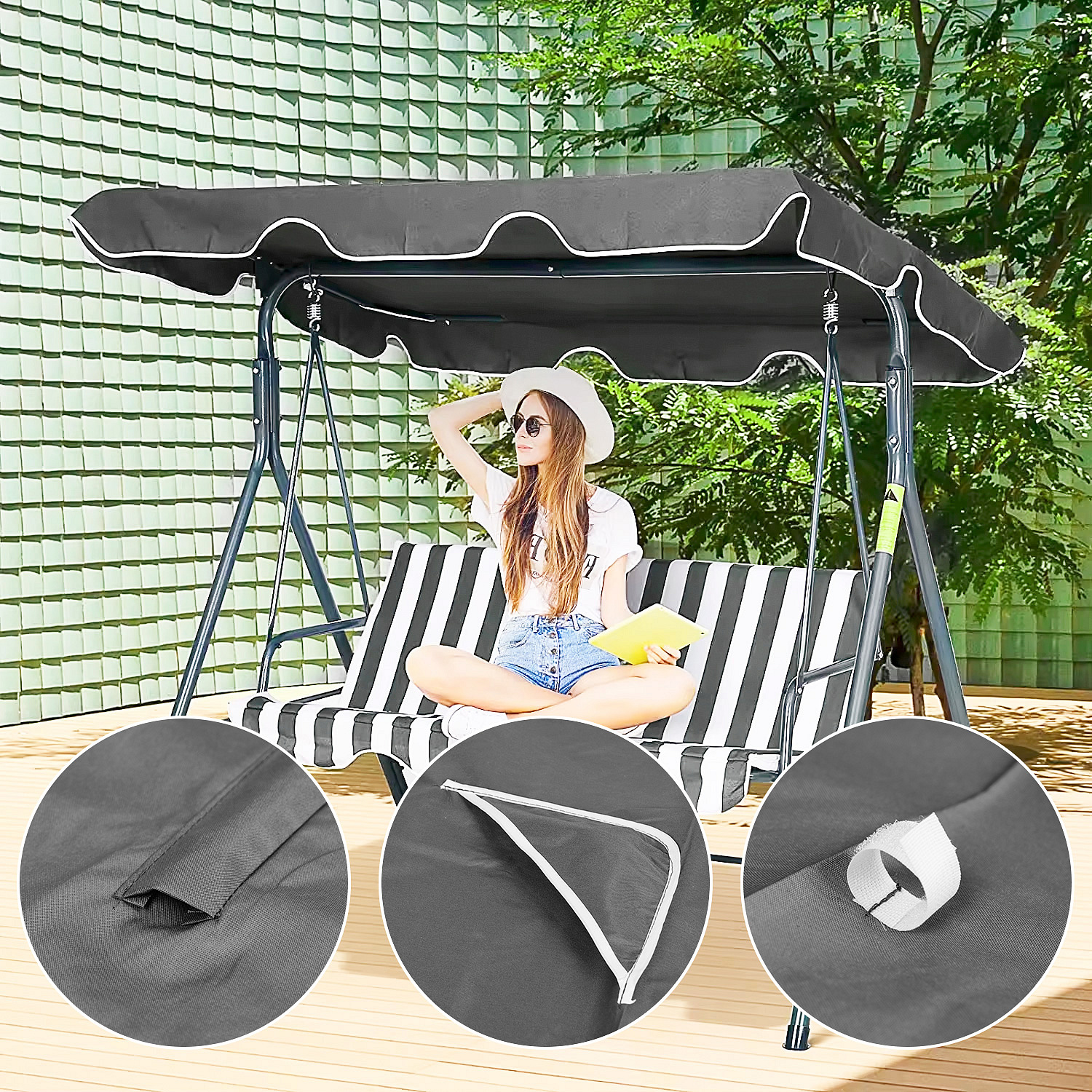Thanks to its well-thought-out design, the canopy cover can be easily mounted on your swing frame. Special frame sleeves, corner pockets, and additional Velcro fasteners allow installation on most garden swings available on the market. It only takes a moment to install the canopy and enjoy relaxing outdoors again.