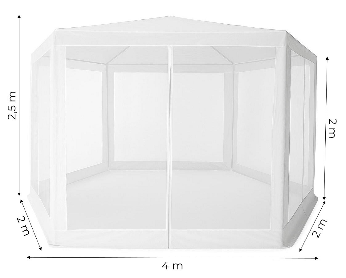 Mosquito netted walls effectively protect the inside of the tent from insects, while allowing natural light in. This ensures that the space inside remains bright, airy, and comfortable, even on hot days. The tent features a zippered entrance, providing quick and convenient access to the interior. This practical solution makes it easy to use the pavilion, especially when frequently moving in and out.