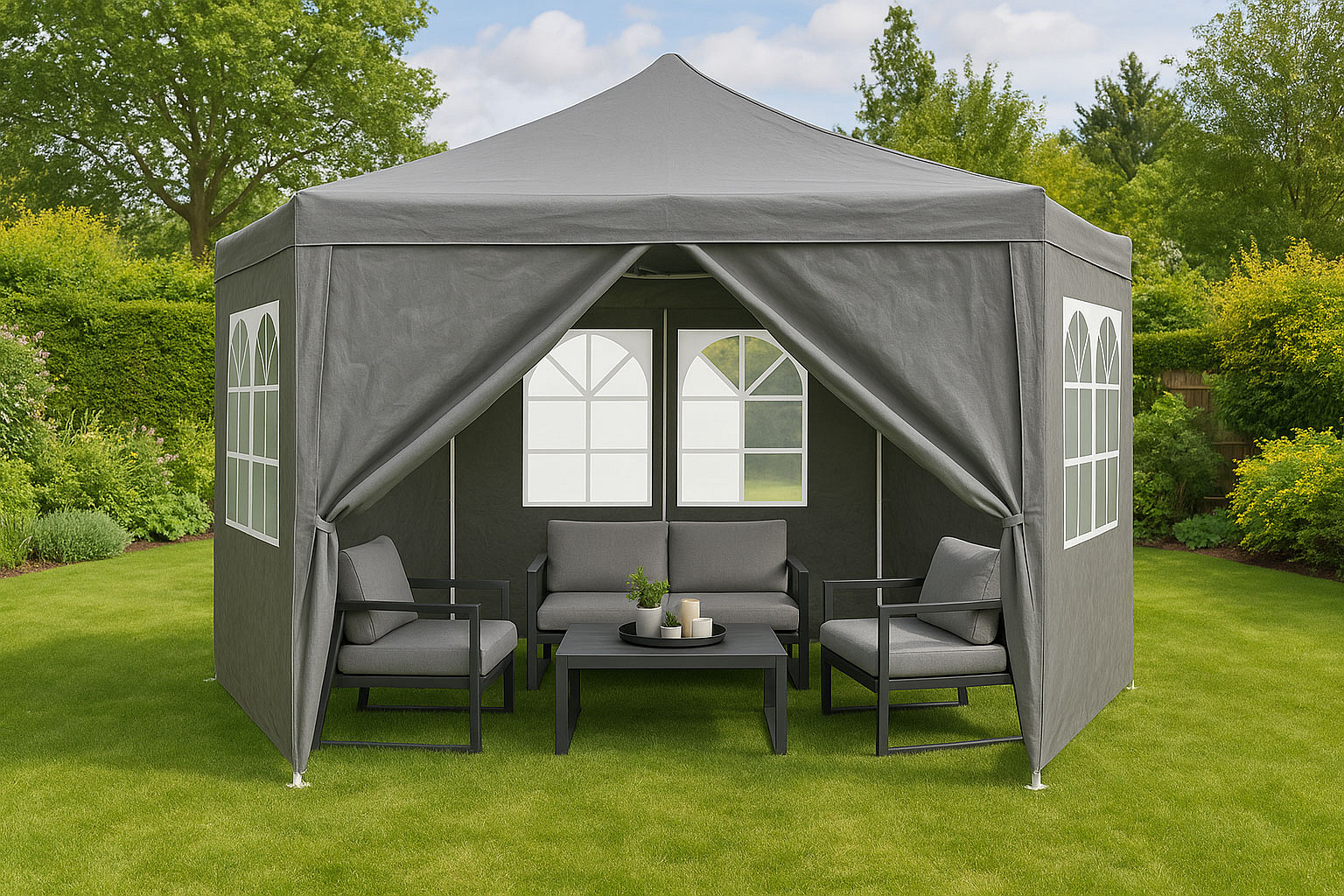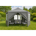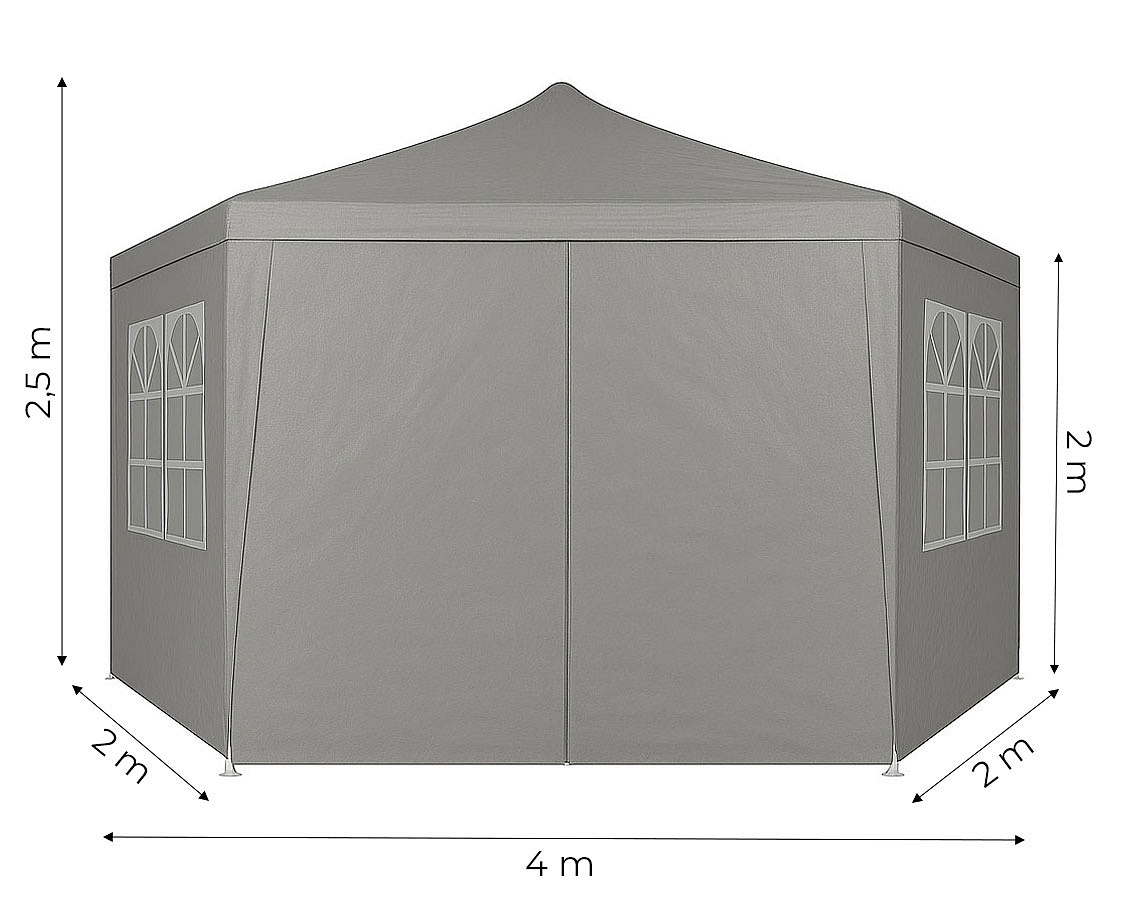 The pavilion walls are equipped with large windows that provide access to natural light inside while protecting against wind and precipitation. Thanks to them, the interior of the pavilion is brighter and more welcoming, which increases comfort during meetings, parties or outdoor events. The tent features an entrance closed with a zipper, ensuring quick and convenient access to the inside. This practical solution makes the pavilion easier to use, especially when you frequently move between its interior and the surroundings.