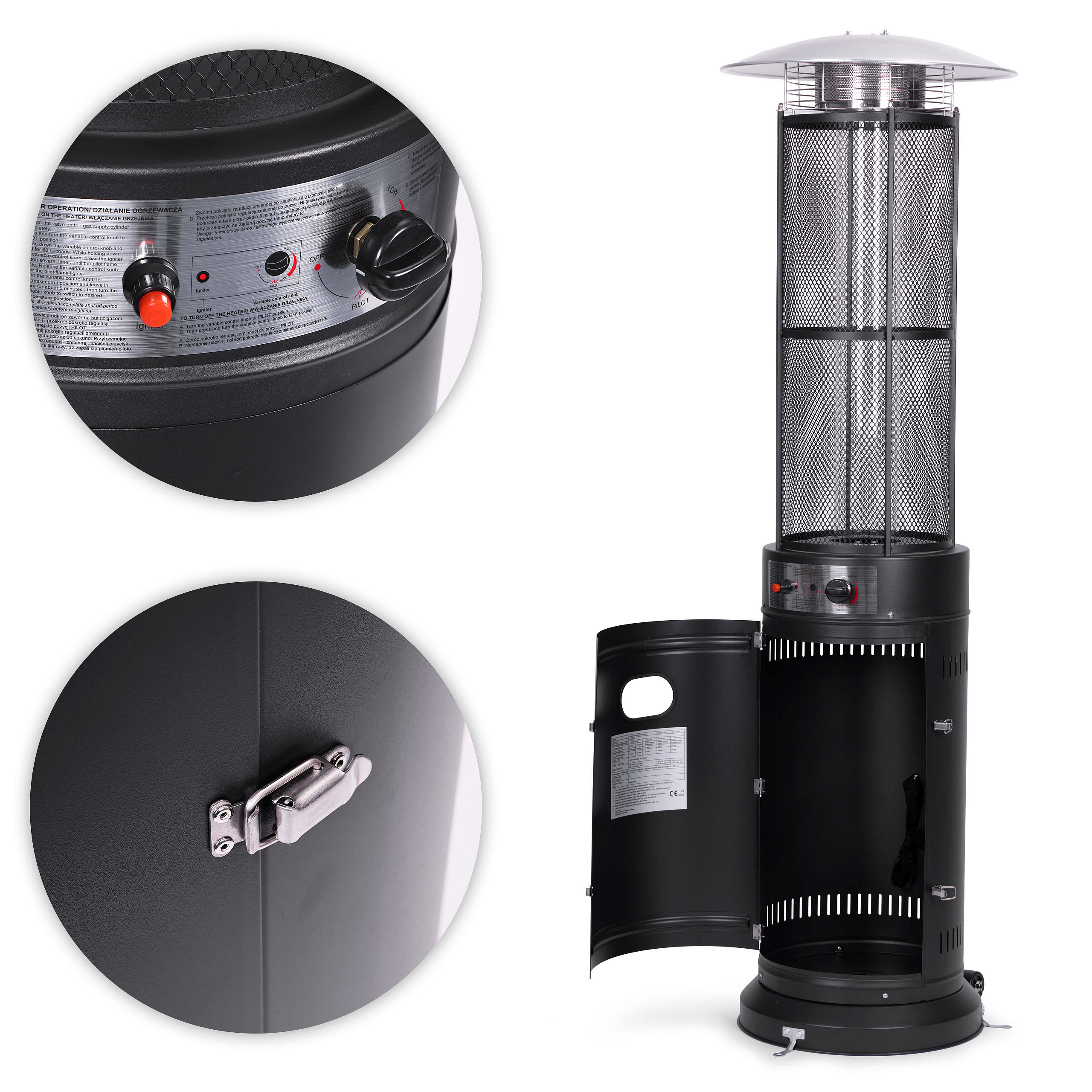 The heater features a concealed compartment for the gas cylinder, ensuring both an aesthetic look and increased safety. The functional door provides easy access while keeping the cylinder hidden, maintaining the elegant design and high safety standards. Additionally, the cylinder is secured with a special strap to prevent movement during transportation or repositioning.
