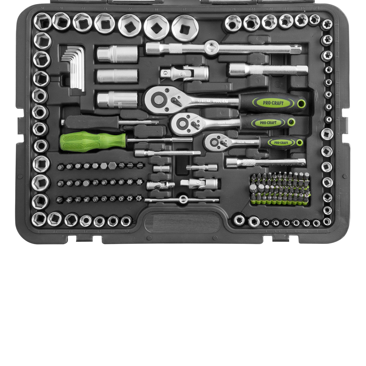 Gola sada Procraft WS-216 obsahuje 216 kusů nářadí z kvalitní CR-V a karbonové oceli. Ideální pro pr