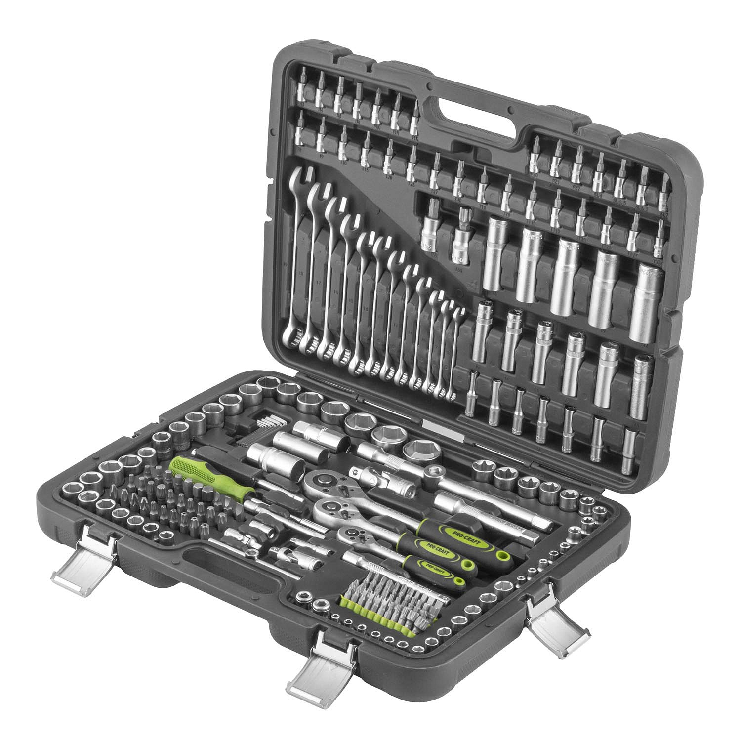 Gola sada Procraft WS-216 obsahuje 216 kusů nářadí z kvalitní CR-V a karbonové oceli. Ideální pro profesionální i domácí použití díky bohatému příslušenství: hlavice, bity, klíče a ráčny v praktickém kufru pro snadnou organizaci a přenos.
