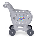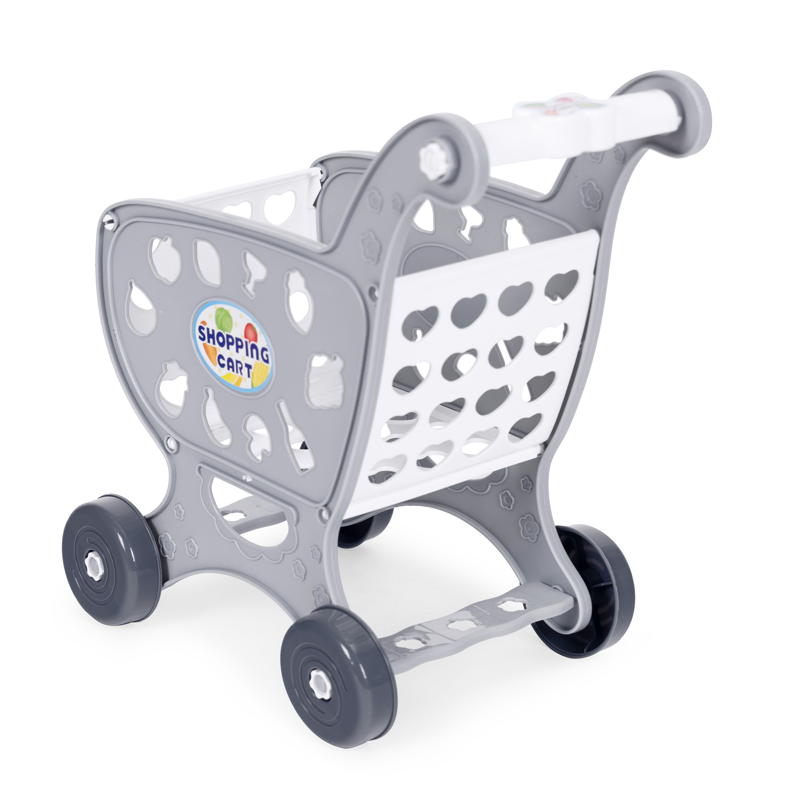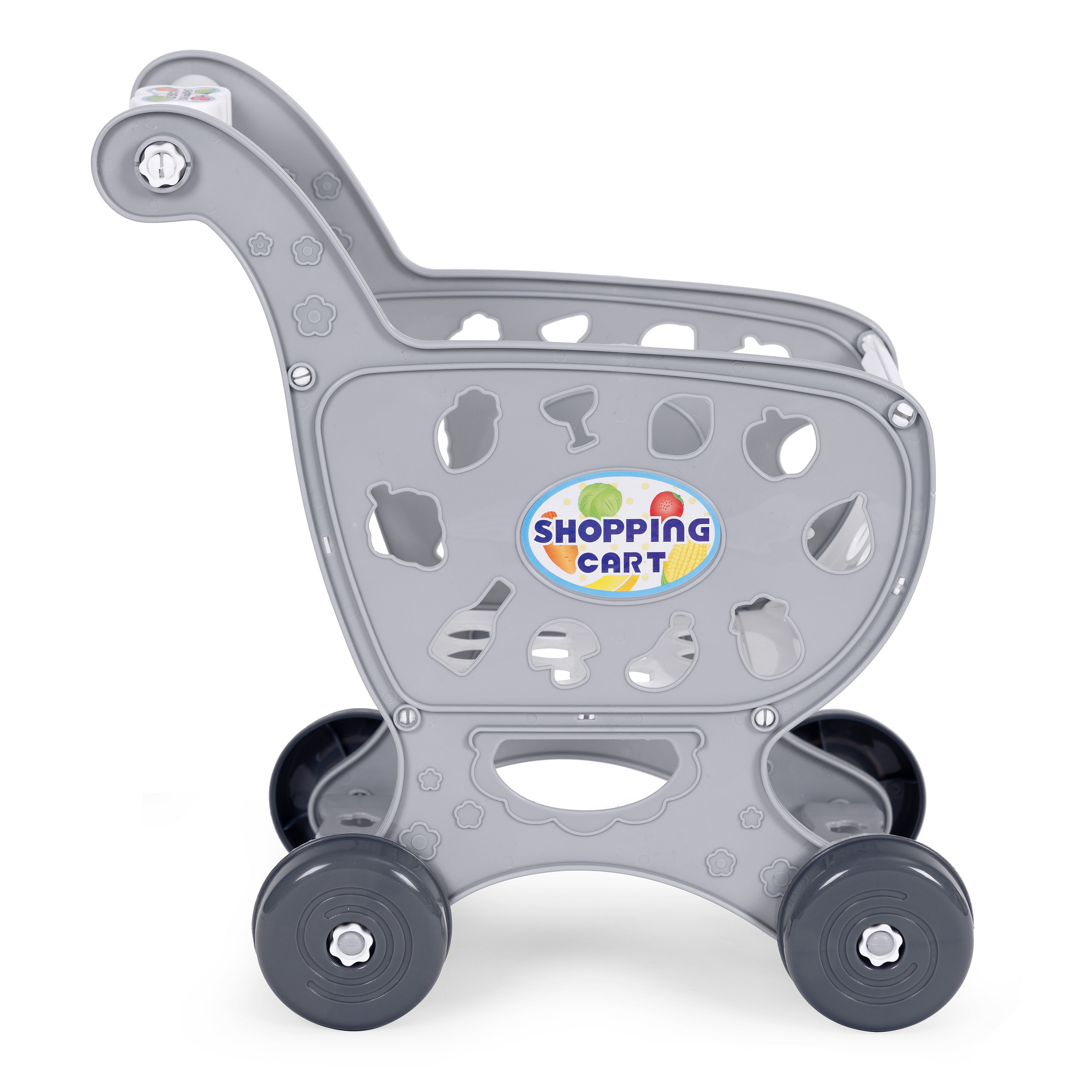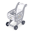 Gray children's shopping cart for supermarket or kitchen play + 18 accessories