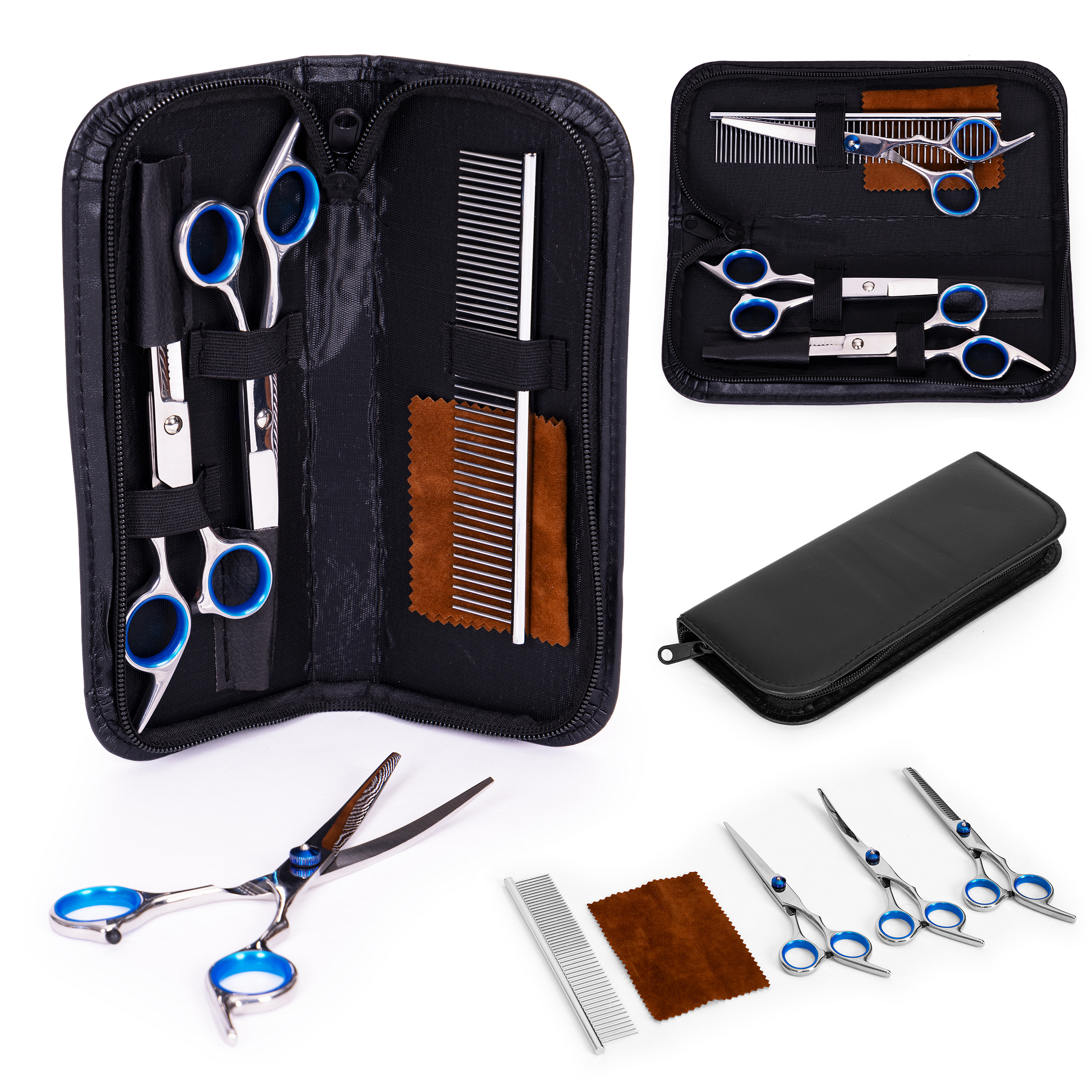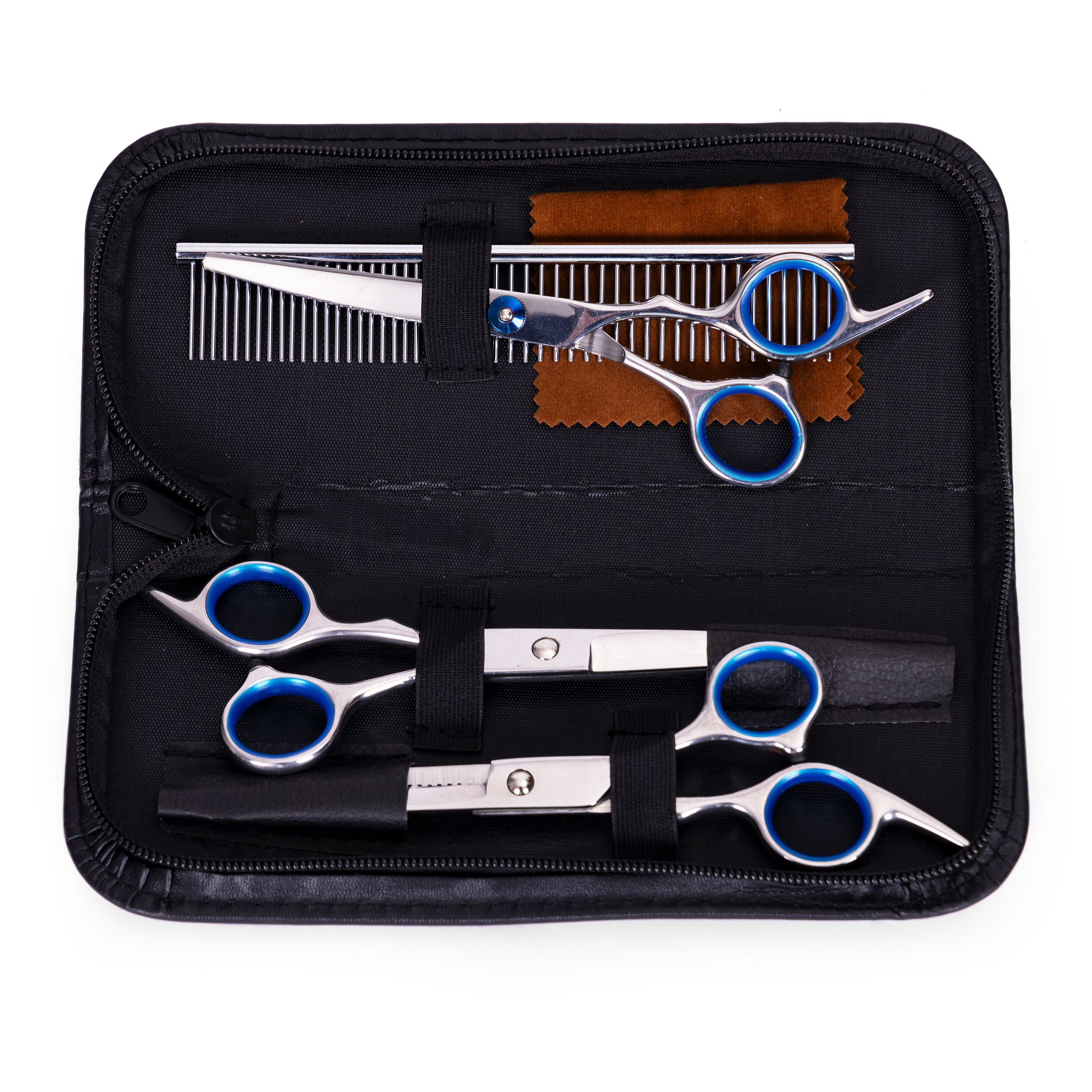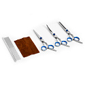 This scissors set is designed for safe grooming and care of dogs and cats, offering precision and comfort for both the owner and the pet. The set includes three different types of scissors for various grooming needs. It also comes with a practical comb suitable for both smooth and tangled fur, all packed in a compact eco-leather case.