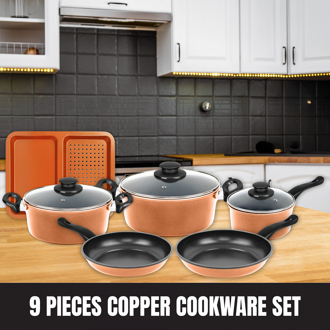 Introducing the Herzberg HG-04838: a 9-piece non-stick copper cookware set designed to elevate your cooking experience. This versatile set includes a 22cm x 24 x 12cm casserole with a lid (3.72L), an 18 x 8.5cm saucepan with a lid (1.4L), a 20 x 9cm casserole with a lid (2.5L), a 20 x 3.5cm fry pan (0.76L), a 26 x 4.8cm fry pan (1.58L), and a 40 x 32 x 2cm oven tray. Each piece is compatible with induction, gas, electric, halogen, and vitro-ceramic cooktops, making it a versatile addition to any kitchen.