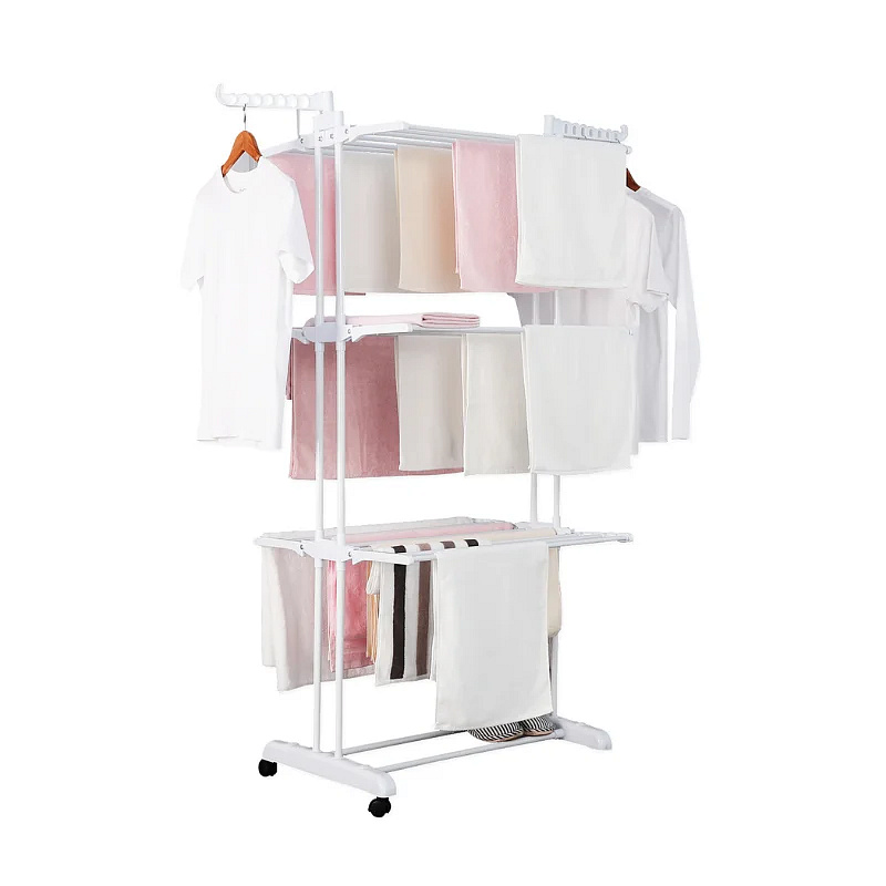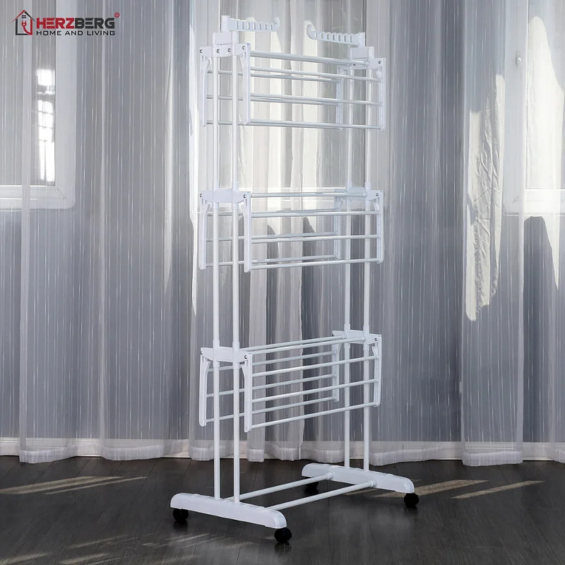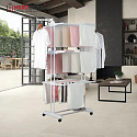 Tento závěsný stojan je vše, co potřebujete od sušení prádla po ukládání oblečení a dalších nositelných věcí. Vyrobeno z vysoce kvalitní odolné a pevné oceli, s práškovým nástřikem pro ochranu proti rzi a korozi, tento pojízdný stojan dokáže zvládnout a uspořádat vaše oblečení. Základna a zařízení jsou vyrobeny z vysoce kvalitního ABS plastu, který zajišťuje odolné spojení s kovem a vytváří pevnou strukturu. Toto se skládá ze 6 skládacích a rozkládacích polic a rozšiřuje požadavky na prostor pro sušení vzduchem. Základna je podepřena 2 práškově lakovanými pevnými ocelovými tyčemi pro lepší podporu, zvyšuje stabilitu a může pojmout boty pro sušení nebo uložení. Obě horní strany mají funkční slot na zavěšení dvou křídel, který umožňuje umístit oblečení s dostatečným prostorem mezi nimi pro maximální sušení nebo jen pro úhledné uspořádání oblečení. Má také snadno přemístitelný design s kolečky, který se skládá z uzamykatelného otočného kolečka pro zajištění nákladu a může být volitelně umístěn z venkovního prostředí do vnitřního. Lehký a pohodlně snadno skládací pro uložení a zaručeně nezabere příliš mnoho místa. Je snadné jej sestavit, protože byl dodán s návodem k použití, který je snadno srozumitelný a krok za krokem. Tento pojízdný stojan na oblečení je všestranný, lze jej použít jako sušicí stanici nebo organizér na oblečení a otevřenou šatní skříň
