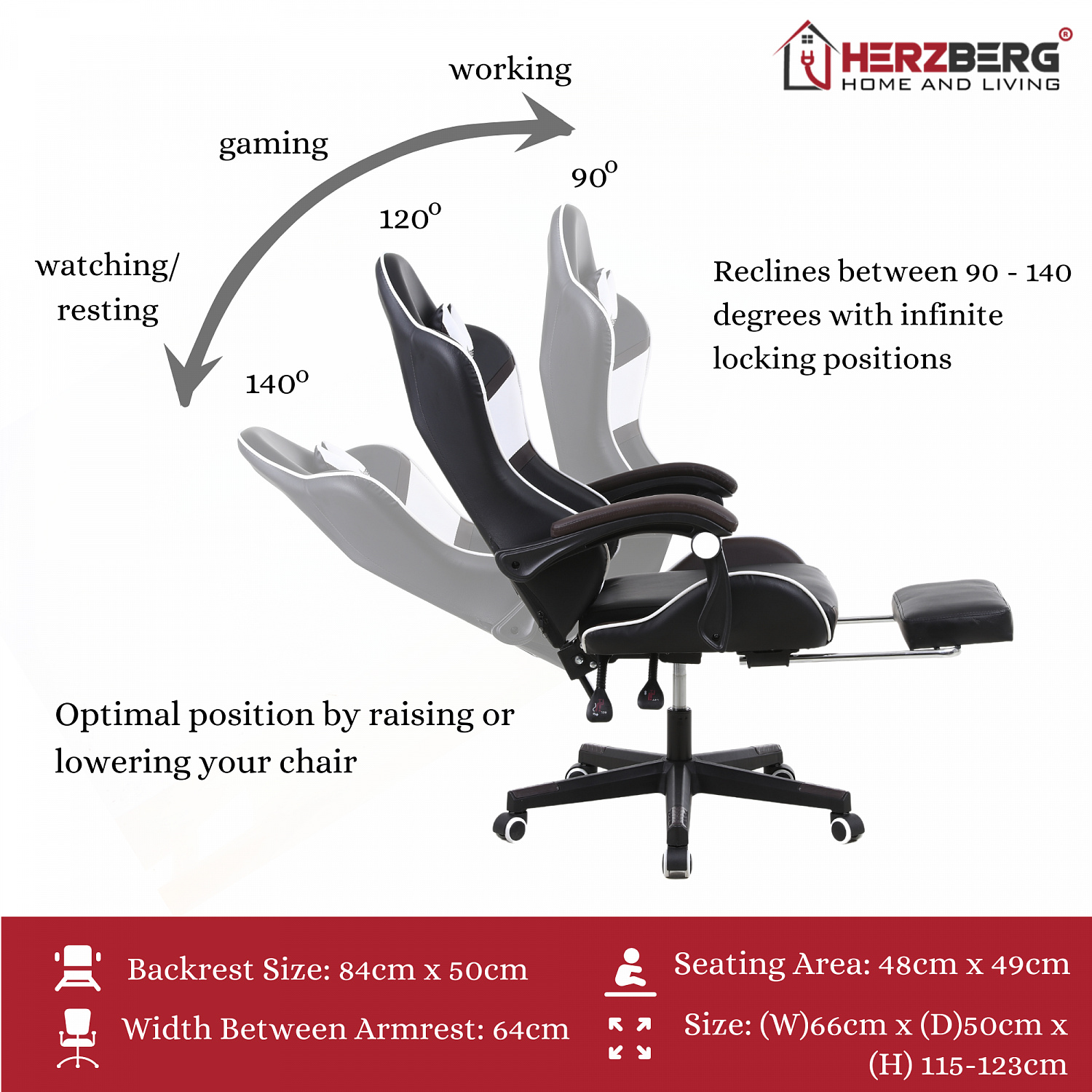 Play games with style, experience office work with comfort, and have an innovative aesthetic in your home with the Herzberg HG-8083, a reclining Gaming and Office chair with a footrest! Say goodbye to the back pains during a long period of sitting, experience comfort while working and taking a rest, relax while watching movies, or just have a little nap without moving out from your desk. This ergonomic design chair is made from breathable premium PVC leather materials. The strong metal frame is covered with this eco-friendly PVC leather and 5 inches of high-density foam. The segmented padded design offers contoured support while the backrest offers a complex and meticulous padded tri-color design with a linear accent that presents an exquisite style and enhances air permeability on the chair surface. The wingback design along with the lumbar pillow offers a multi-contact that eases any lumbar pressure while the neck pillow supports the spine.