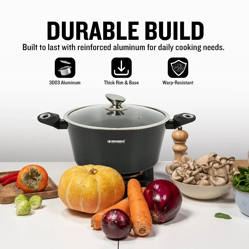 The Herzberg HG-METBK15: 15-Piece Marble Coated Cookware Set is the ultimate kitchen companion for home cooks and culinary enthusiasts seeking both performance and style. This versatile set includes a complete range of saucepans, casseroles, and fry pans with matching glass lids, allowing you to prepare anything from everyday meals to gourmet dishes with ease. Each piece features a 2-layer marble-coated interior, providing excellent non-stick performance for healthier cooking with minimal oil and effortless cleanup.