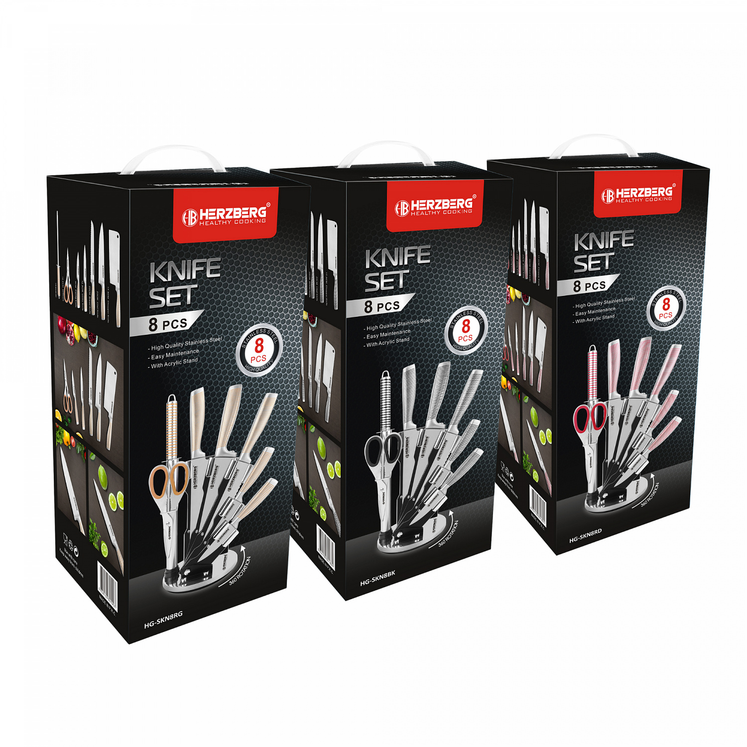 To keep your knives organized and within easy reach, the set is housed in a rotating acrylic stand that provides both practicality and style. The transparent design allows you to see each knife clearly, while the rotating feature ensures easy access to your tools at all times. Whether you're a home cook or a professional chef, the Herzberg HG-SKN 8-Piece Knife Set is designed to enhance your culinary experience, offering the perfect balance of durability, efficiency, and aesthetic appeal.