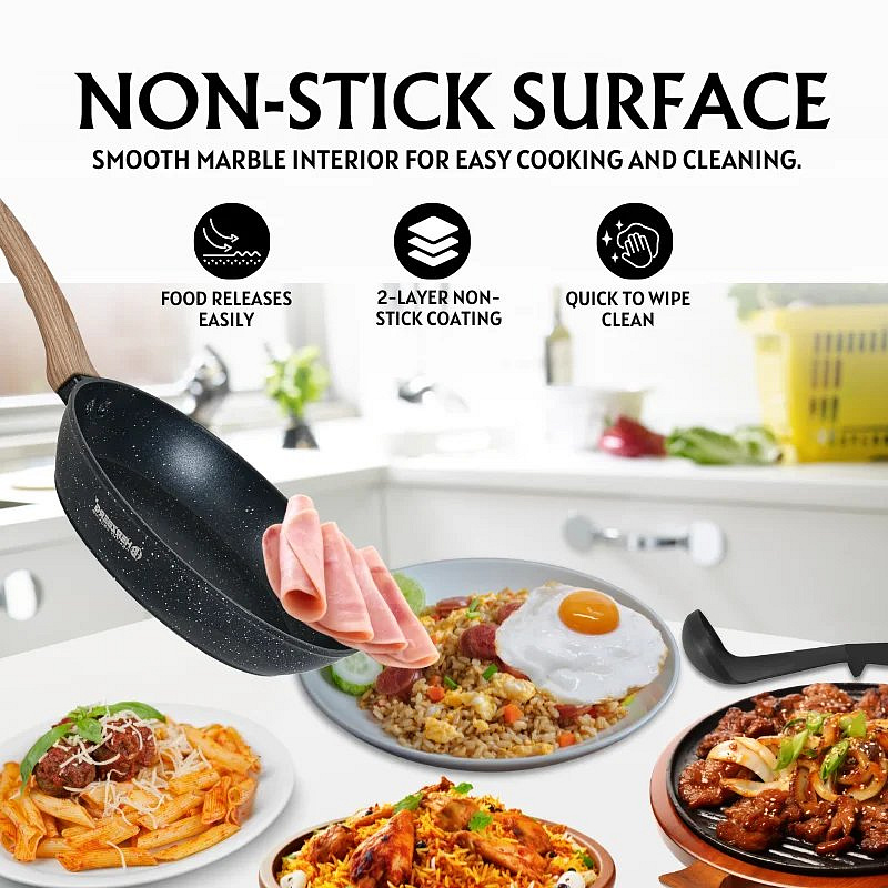 - High-Grade Forged Aluminum Construction: Made from durable 3003 aluminum, the cookware ensures even heat distribution with reinforced rims and bases that resist warping over time—even with frequent use.