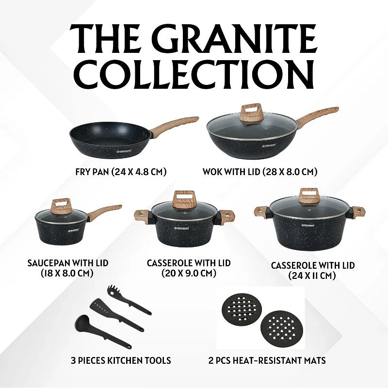 The HG-WDMRB14 set includes 14 essential kitchen pieces, from a saucepan and three casserole sizes with lids to a fry pan, three matching utensils, and two bakelite mats for heat protection. Whether you're preparing daily meals or entertaining guests, this cookware set delivers professional performance, durable construction, and timeless kitchen style—all in one coordinated collection.