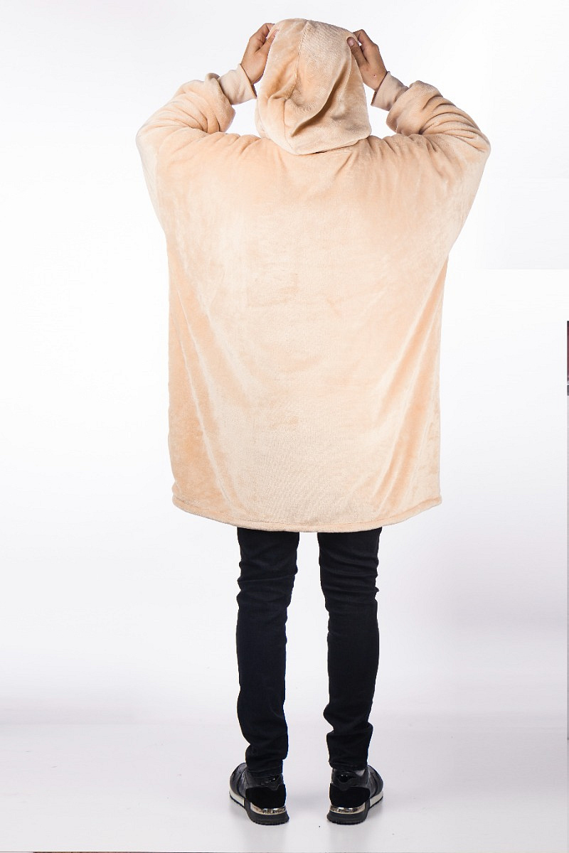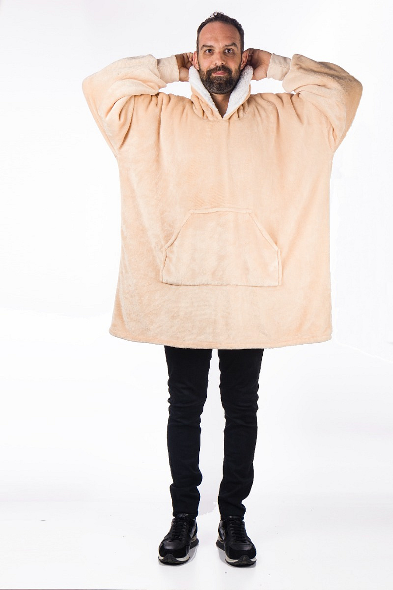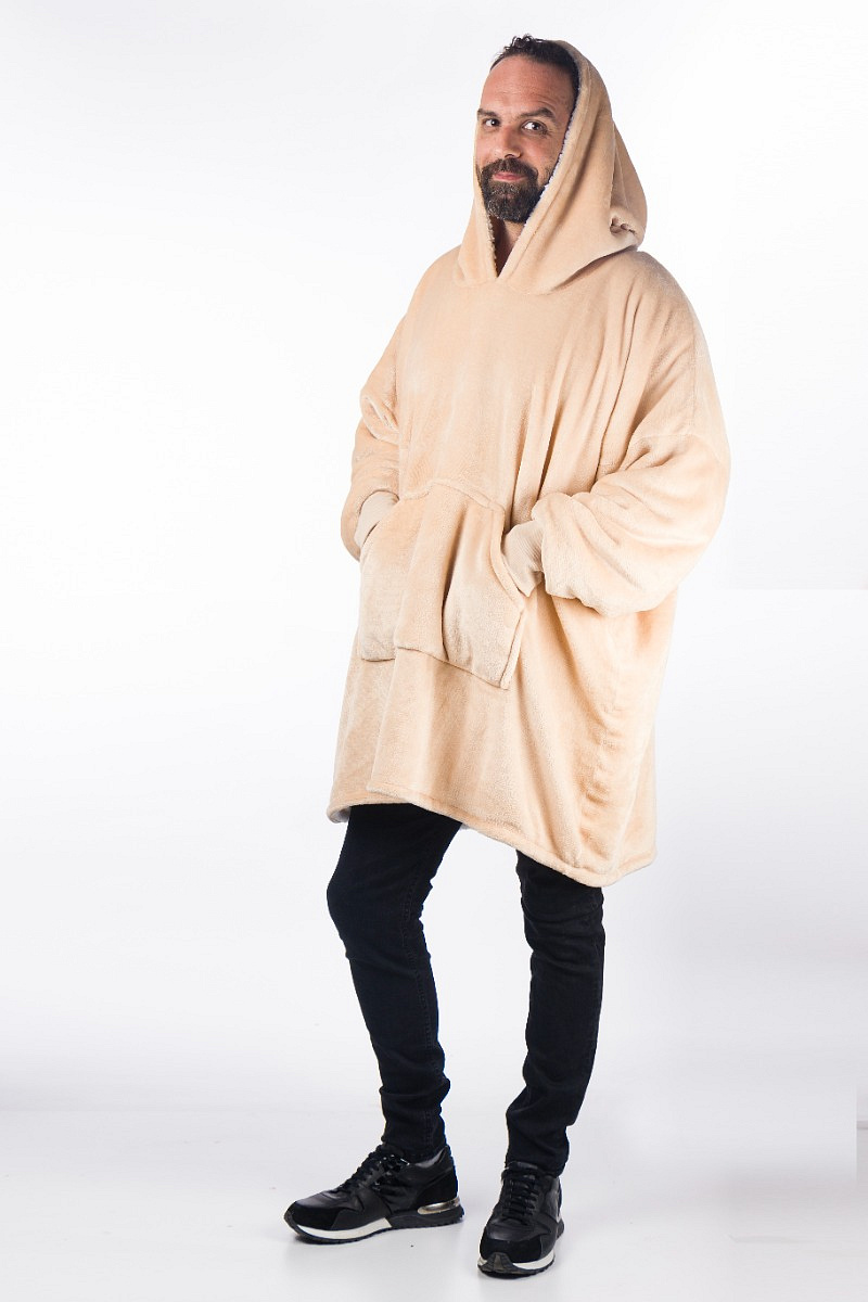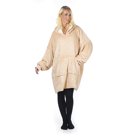 The advantage of the big cuddly sweater is that you can cover yourself completely with the ultra soft teddy Sherpa fleece. The sleeves fit perfectly so that no heat is lost there and you can easily grab food and drinks. Thanks to the handy pouch pocket on the front, your hands will also stay warm. You can also completely cover your legs by pulling them in. Because you wear the hoodie blanket like a sweater, you can enjoy the wonderful warmth everywhere.