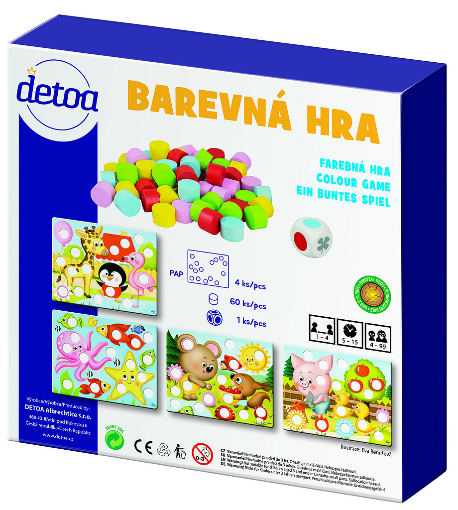 Vkládejte kameny do předloh po hodu kostkou. Cílem hry je zaplnit kartu 15 barevnými válečky. Každý hráč si vezme 1 papírovou kartu a 15 válečků – tři od každé barvy. Hráči se ve hře střídají – hod kostkou určuje, který barevný váleček smí hráč umístit na svou kartu. Balení obsahuje: 60 barevných válečků, 1 hrací kostku, 4 papírové karty. Vhodné od 4 let
