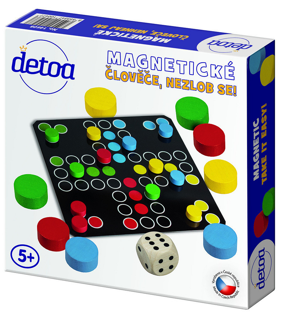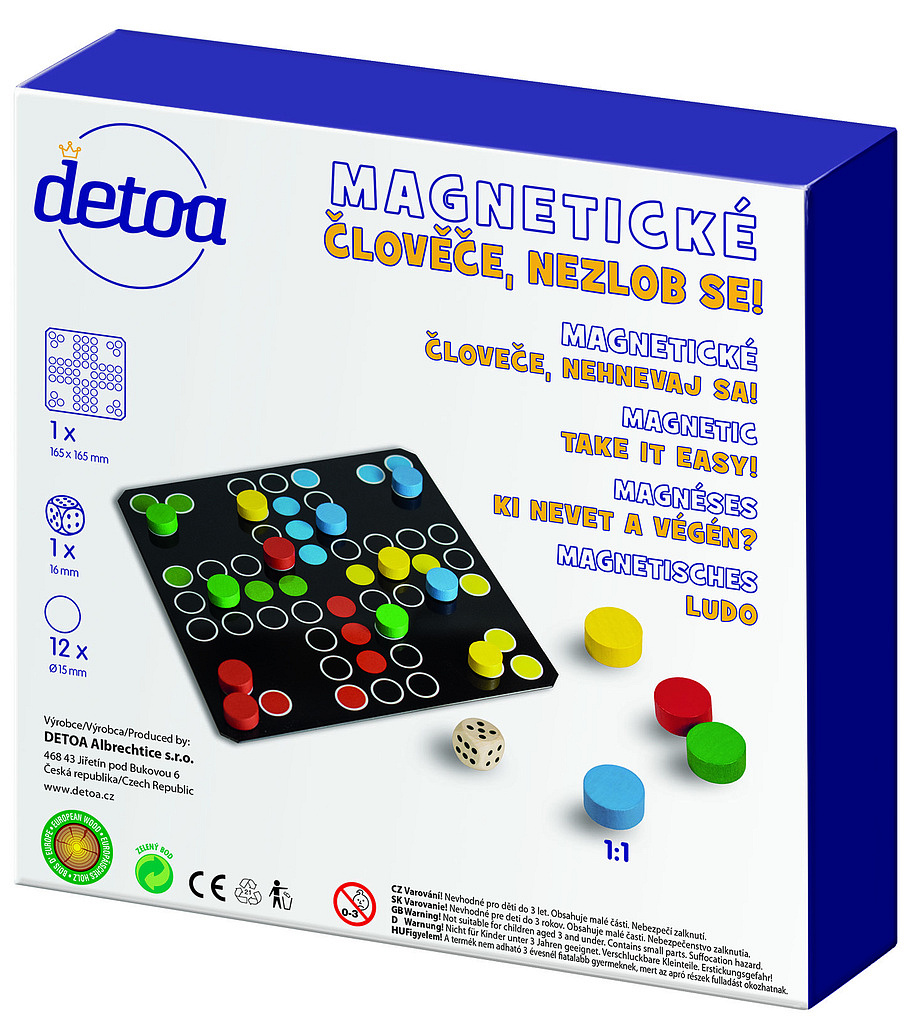 Upravená verze hry pro 4 hráče, ale pouze se 3 figurkami. V magnetické cestovní podobě. Obsahuje 12 magnetických dřevěných žetonků o průměru 15mm, hrací kostku a herní plán. Rozměr krabičky: 20 x 20 x 4 cm Vhodné od 3 let