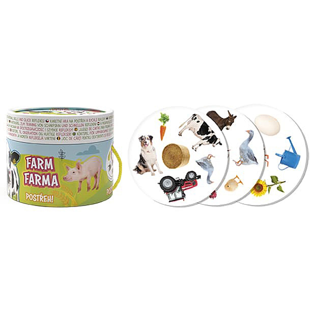 Karetní hra na postřeh a rychlé reflexy obsahuje 30 barevných kartiček ke hraní v tubě a obrázky k vybarvení s oblíbeným motivem farmy. Součástí balení jsou i pravidla, jak si hru zahrát.