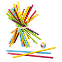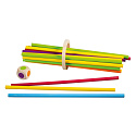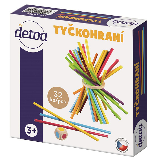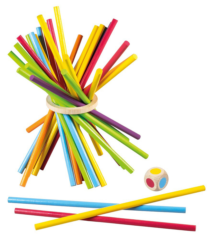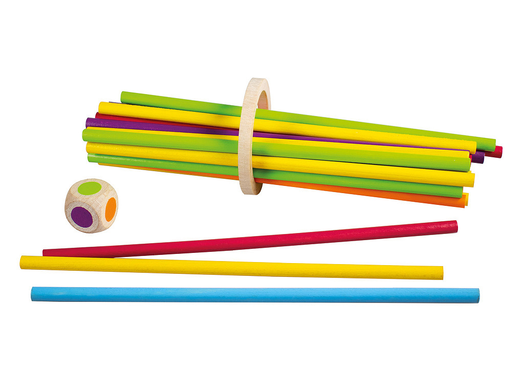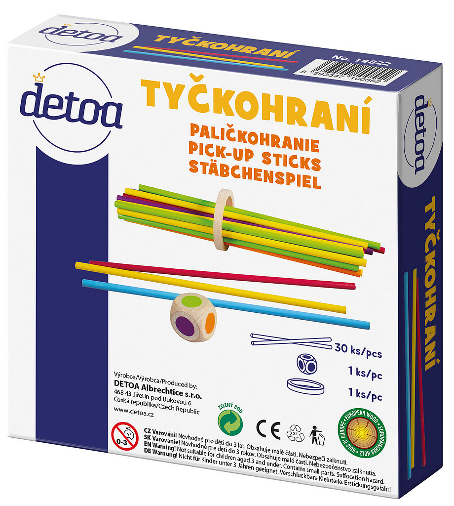 Chcete si zahrát mikádo trochu jinak? Tyčkohraní je hra na procvičení barev a jemné motoriky. Hoďte kostkou a vytáhněte tyčku stejné barvy tak, aby se dřevěné kolečko nedotklo stolu. Varování: nevhodné pro děti do 3 let. Obsahuje malé části. Nebezpečí