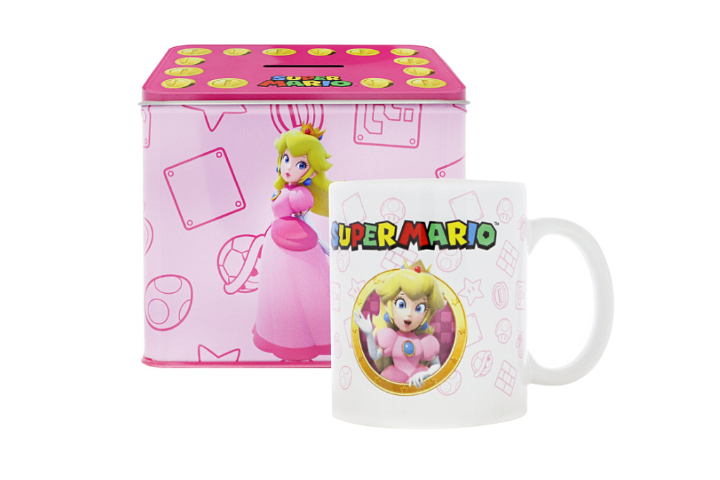 Nintendo Princess Peach ze Super Mario Cup Hrnek s kasičkou Se sadou od Nintenda s půvabnou princeznou ze Super Maria, která se skládá z hrnečku a kasičky, uděláte velkou radost každému fanouškovi Super Maria, velkému i malému, rodině, přátelům nebo sobě. Ať už pijete kávu nebo šetříte peníze – princezna je tu vždy. Kovová krabička a hrníček jsou zdobeny roztomilým potiskem a lze je také použít jako dekorace nebo k rozšíření vaší sbírky Super Mario. Kovová kasička se štěrbinou a víčkem 9 x 13 x 11 cm Keramický hrnek V designu Princess Peach Rozsah Obsah balení: 1 x hrneček Nintendo Princess Peach a kasičkaVíce