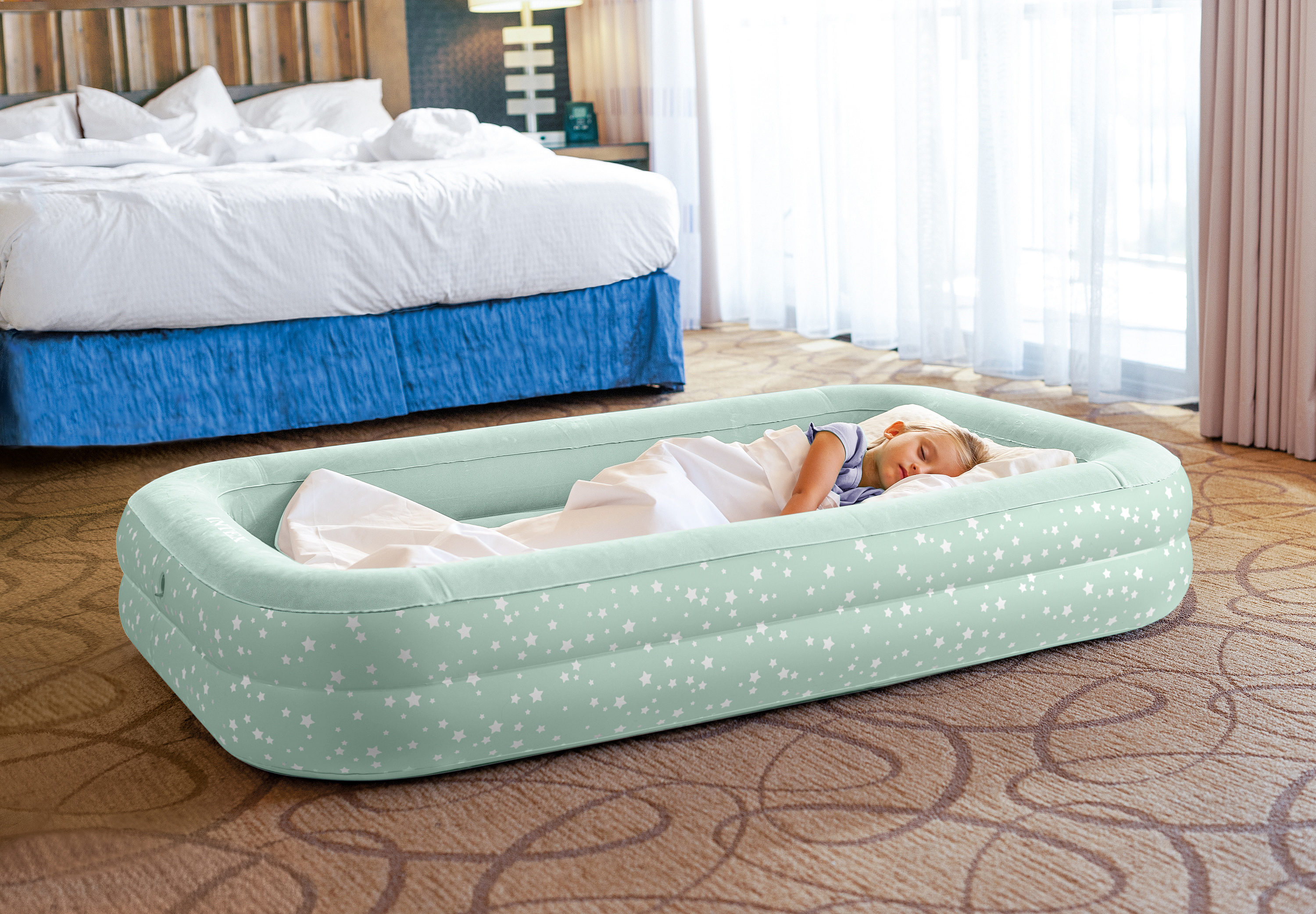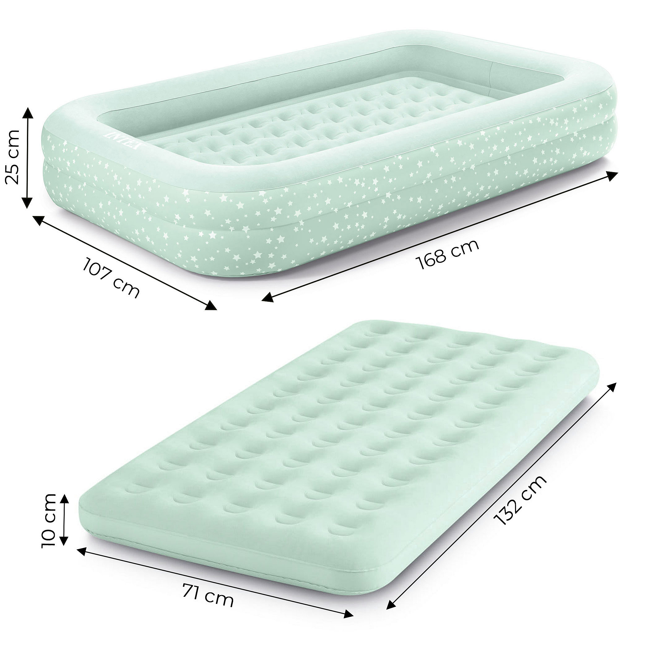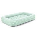 The INTEX velour mattress measuring 168x107x25 cm is ideal for children on the go — in hotels, on campsites, etc. Made of durable PVC and covered with soft-touch, waterproof velour material. The pleasant green color suits any room. The Boston valve allows quick deflation — just one minute to deflate, fold, and store the mattress away.
