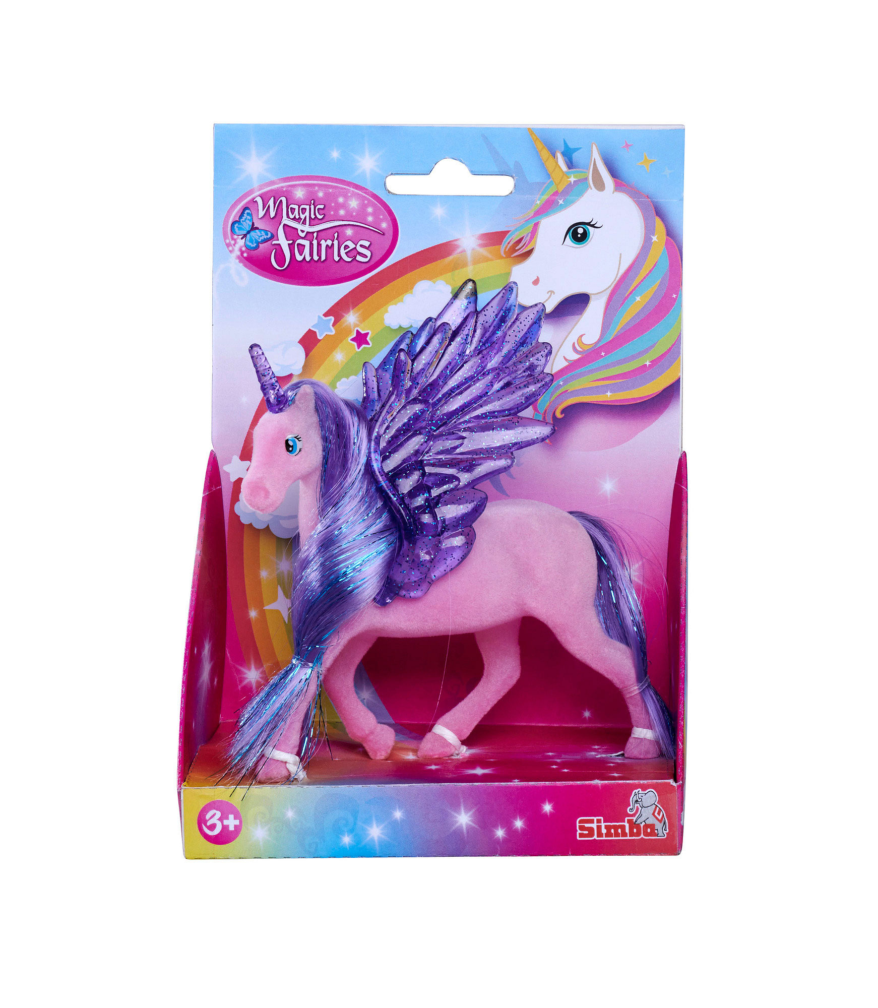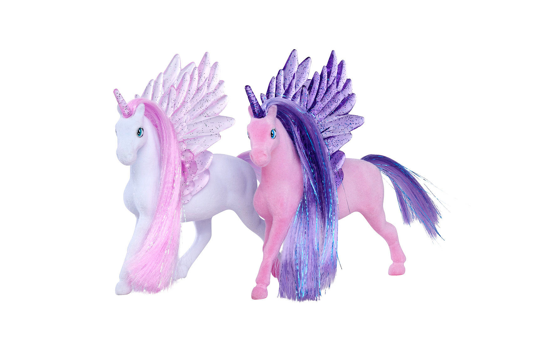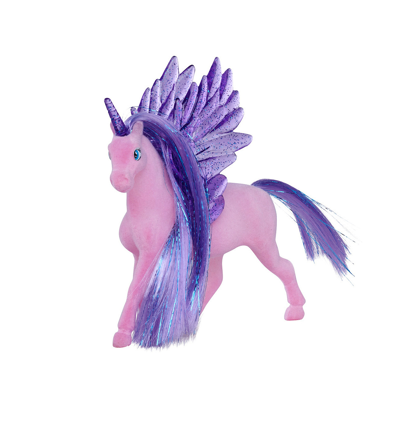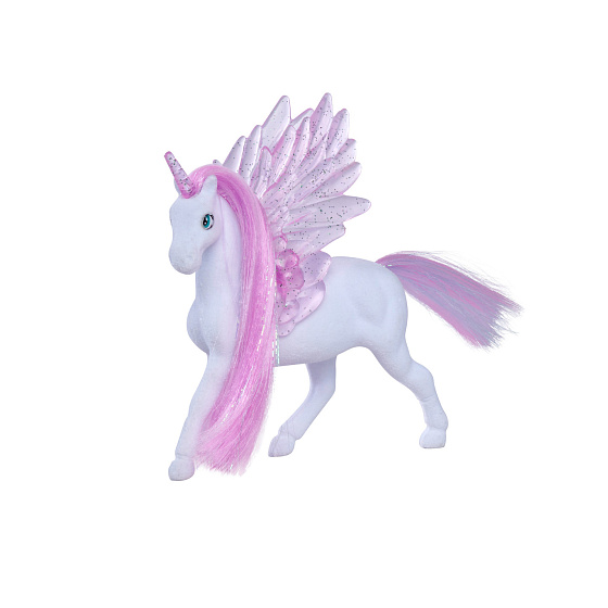 Figurka jednorožce s třpytivými poloprůhlednými křídly a rohem. 2 druhy. Velikost 11 cm.