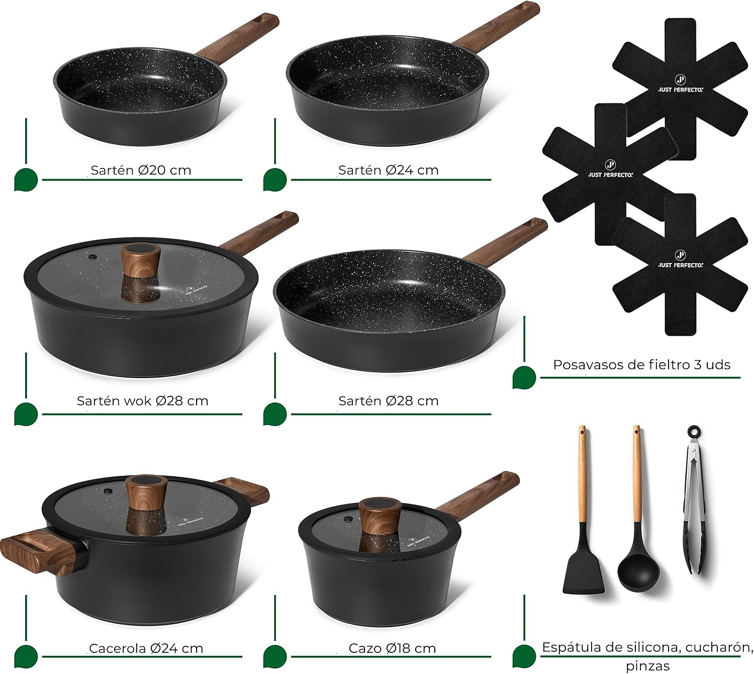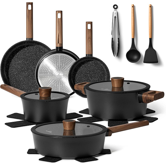 - Complete 15-Piece Kitchen Set: Includes three frying pans, two saucepans with glass lids, one wok, one milk pan, three felt trivets, and three essential utensils—delivering a comprehensive cooking setup for every culinary task.