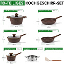 - Complete 14-Piece Cookware Set: Includes two saucepans, two frying pans, one deep frying pan, one steam pot, one silicone spatula, and matching glass lids—covering all basic cooking needs in one elegant set.
