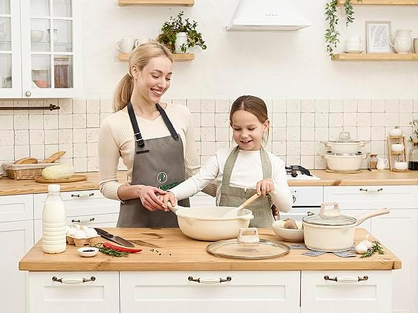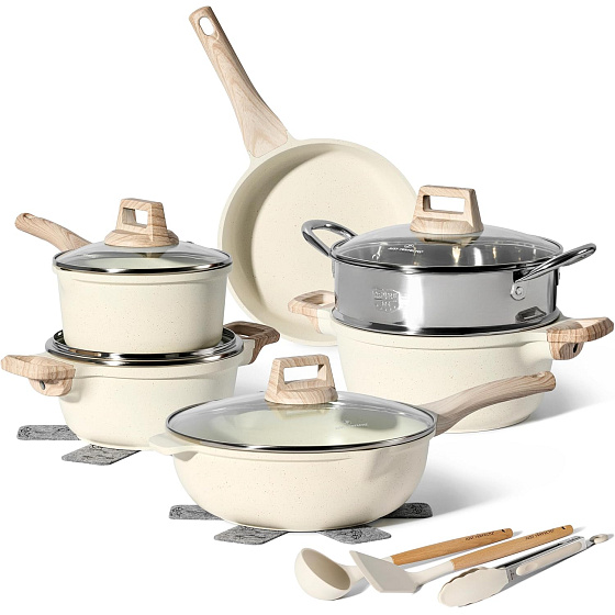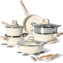 For wholesalers and retailers, this beige cookware set combines a modern granite look with coordinated glass lids and wood-effect handles for strong shelf appeal. The inclusion of a steamer, utensils, and heat mats increases perceived value, while the PFAS-free coating, induction compatibility, and durable build support excellent customer satisfaction and repeat orders, ensuring consistent turnover in cookware, home, and gift categories.