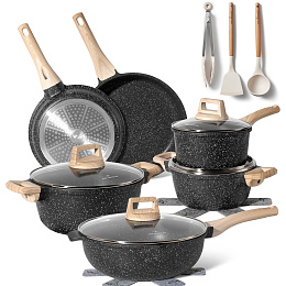 - Complete Multi-Purpose Set – The assortment includes casseroles, frypans, wok, saucepan, and kitchen utensils suitable for frying, sautéing, simmering, boiling, and everyday meal preparation. This comprehensive set replaces multiple standalone cookware pieces.