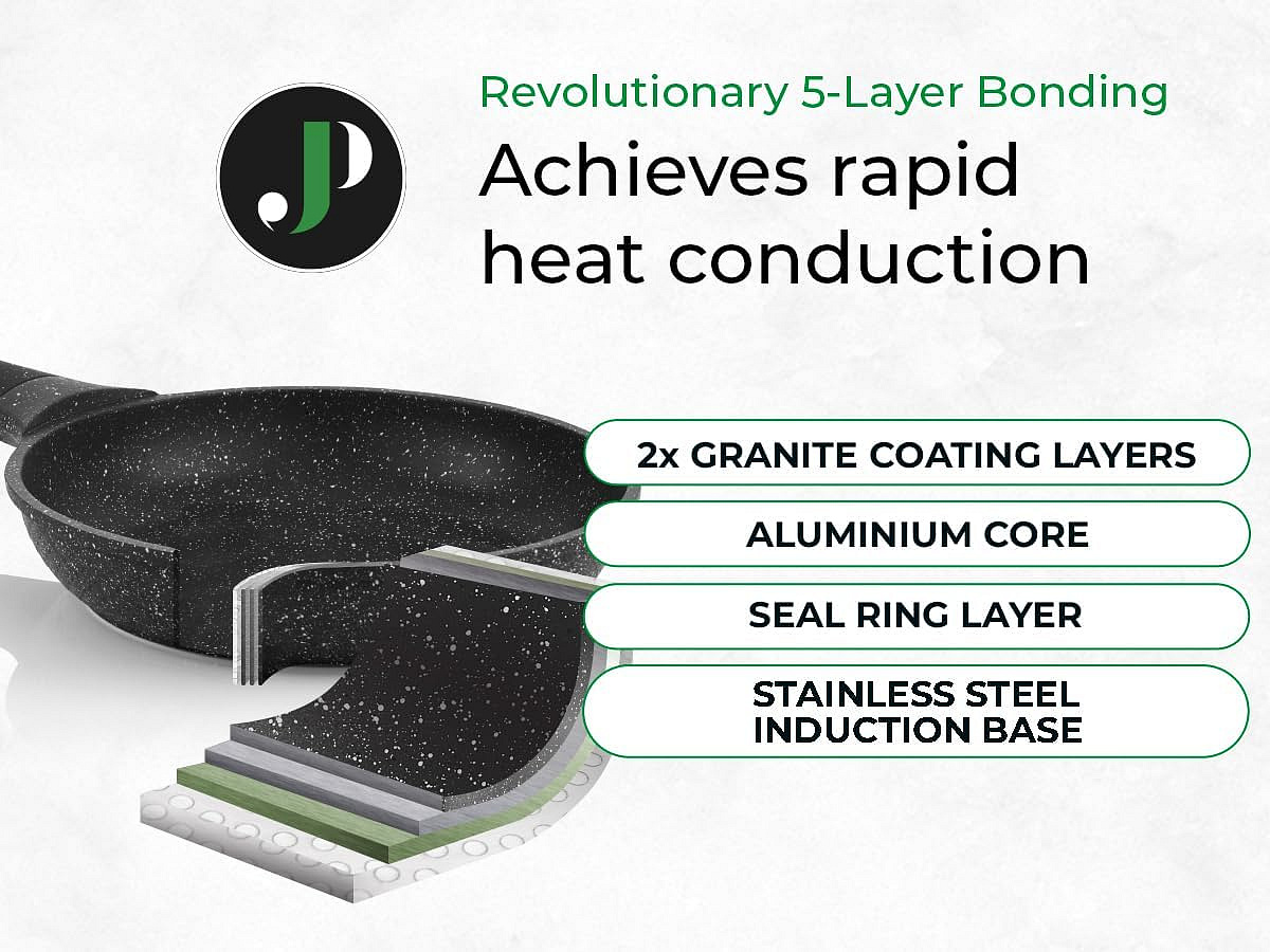 - Heat Distribution: Multi-layer structure with granite coating, aluminum core, seal layer, and stainless steel induction base