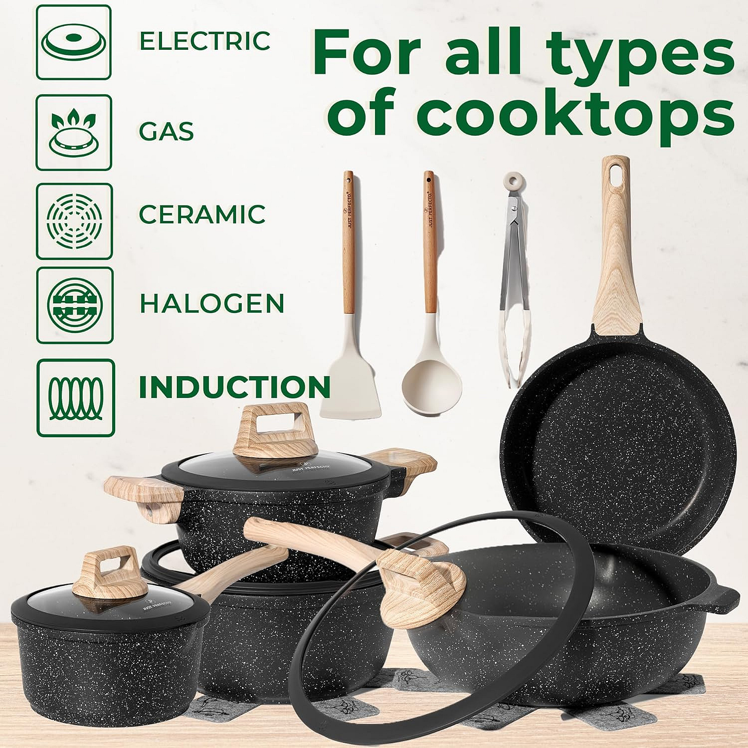 The Just Perfecto JL-889 is a 14-piece granite cookware set designed for modern homes and high-demand retail environments. Built from durable die-cast aluminum, each pot and pan delivers fast, even heat distribution for consistent cooking performance on any stovetop, including induction. Its multi-layer granite ceramic coating supports healthier cooking with minimal oil, while maintaining reliable non-stick performance during everyday use. The combination of casseroles, a wok, a frying pan, a saucepan, and essential utensils makes this set a complete cooking solution for daily family meals and diverse culinary routines.