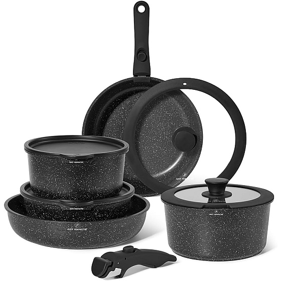 The Just Perfecto JL-998 is an 11-piece granite cookware system designed for compact, modern kitchens that demand versatility, space efficiency, and healthier non-stick performance. Built from durable die-cast aluminum with a PFAS-free ceramic granite coating, the set ensures even heat distribution while remaining lightweight and easy to handle. The removable soft-touch handles enable seamless transitions from stovetop to oven, table service, and refrigerator storage, making the JL-998 a multifunctional solution for everyday cooking.