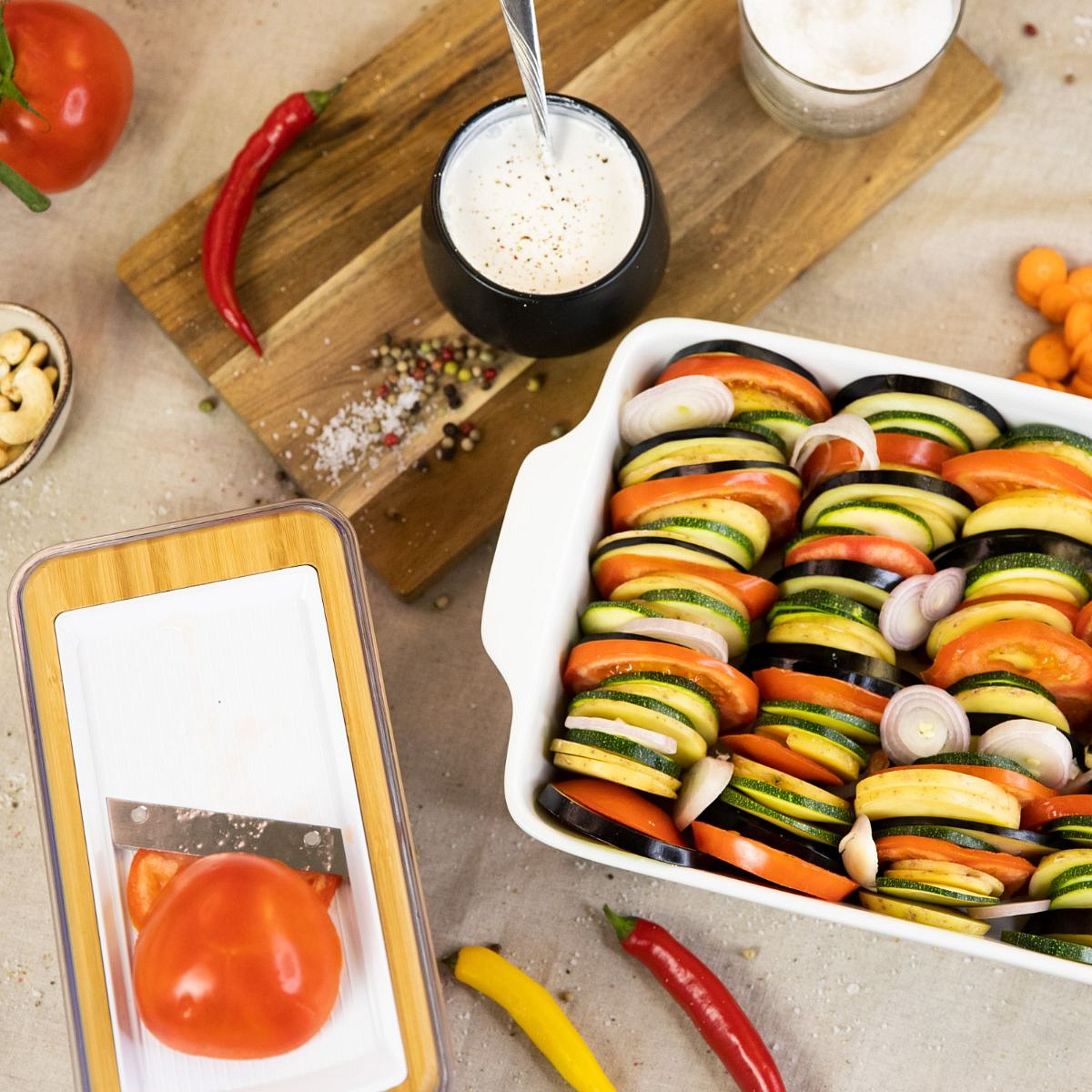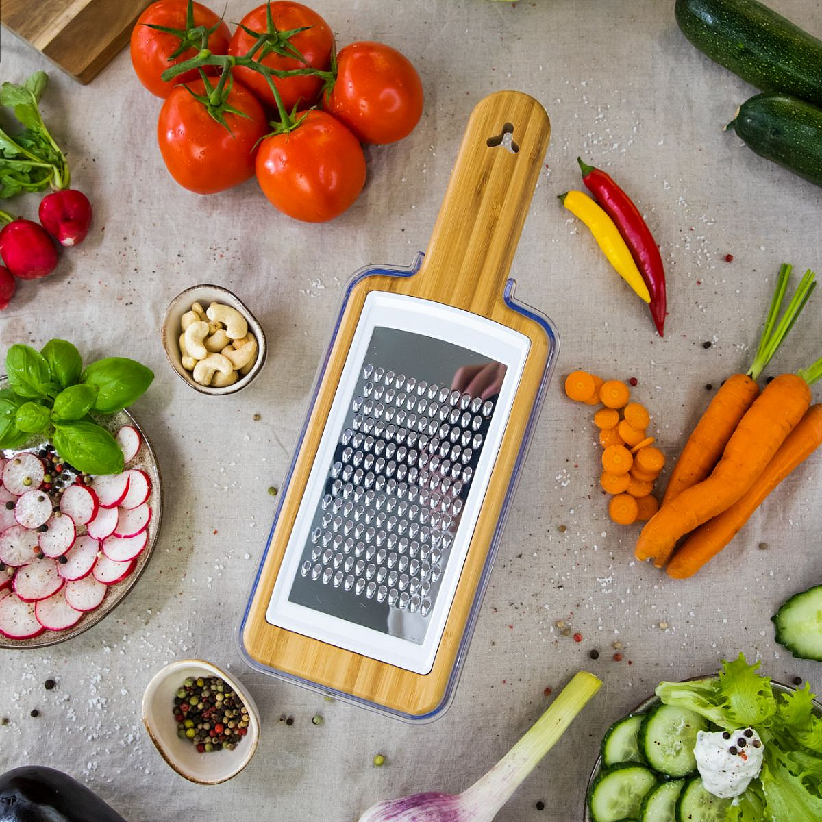 Cutting fruits and vegetables can be a big job, but that is now a thing of the past. With the unique Bamboo Veggi Dicer from Just Vegan you get a very special vegetable and fruit cutter at home. With this compact mandoline you can easily cut and grate fruit and vegetables.