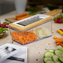 The kitchen cutter has a glass container and a cutting lid made of sustainable bamboo. The lid also has a handle so that you can easily hold the grater. This mandoline comes with a handy cutting aid, with which you can press your fruit or vegetables firmly against the cutting blade and you also protect your fingers and hands. In addition, you can use the glass container to stylishly store food. Whether in the fridge or in a kitchen cupboard, everything is possible. The glass container can be filled with cold or hot, solid or liquid foodstuffs.