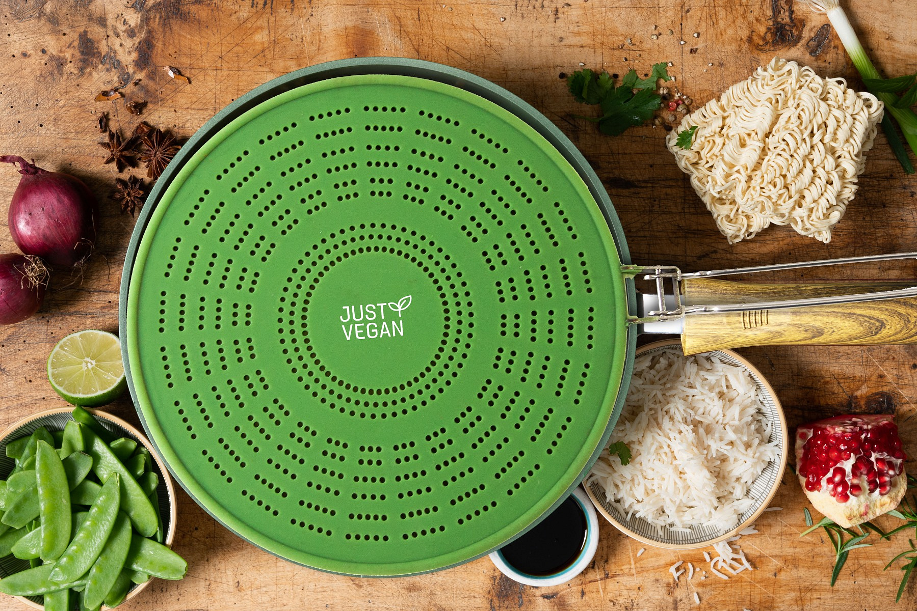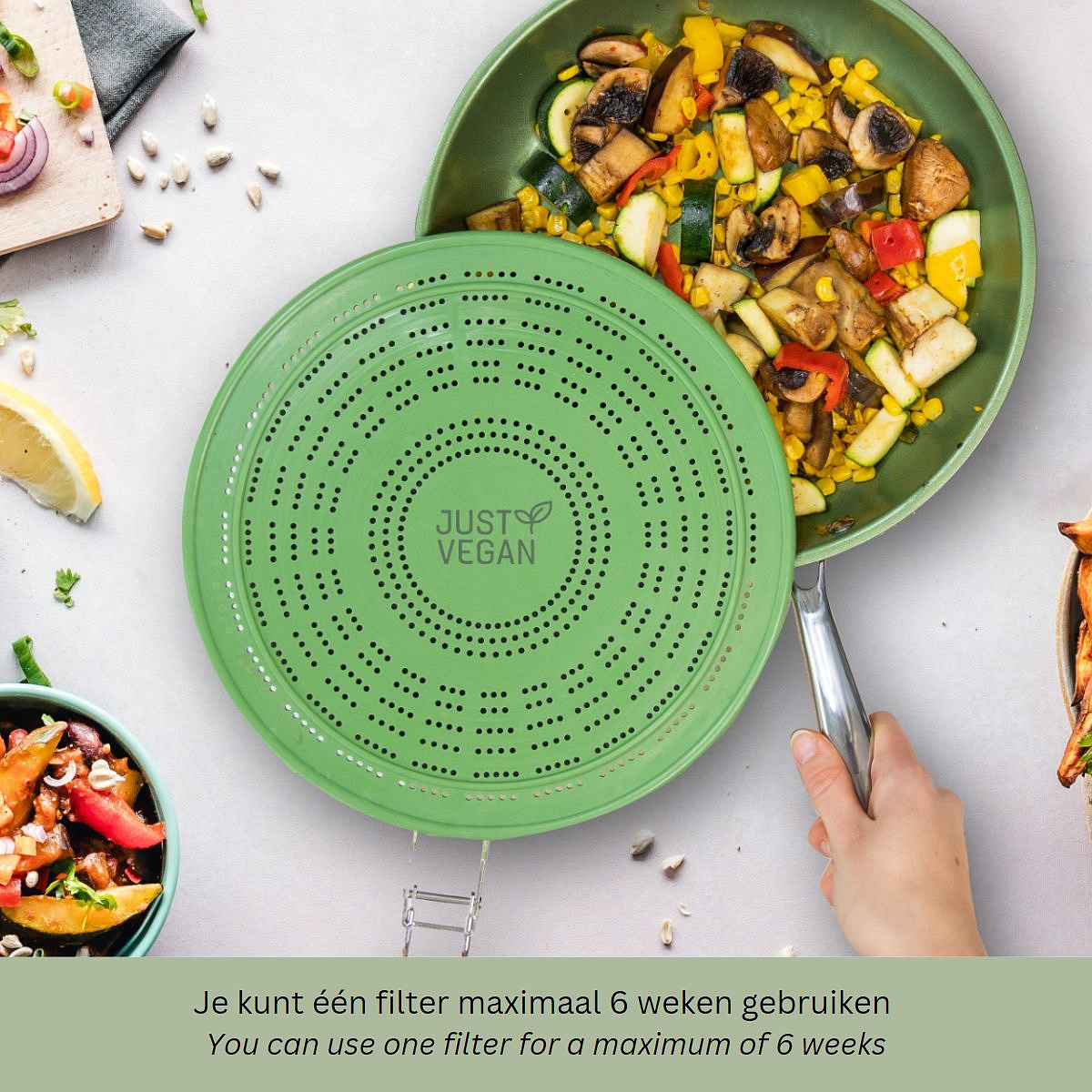 Do you suffer from splashes and unpleasant odors during cooking and baking? That is a thing of the past with this splash cover with removable activated carbon filter. The AirActive from Just Vegan is an innovative splash protection cover that can be used with and without the supplied activated carbon filters. This lid prevents your pan from leaving splashes on the hob and immediately neutralizes bad odors in the pan. The anti-splash lid lets the steam through during cooking but stops 99% of the splashes.