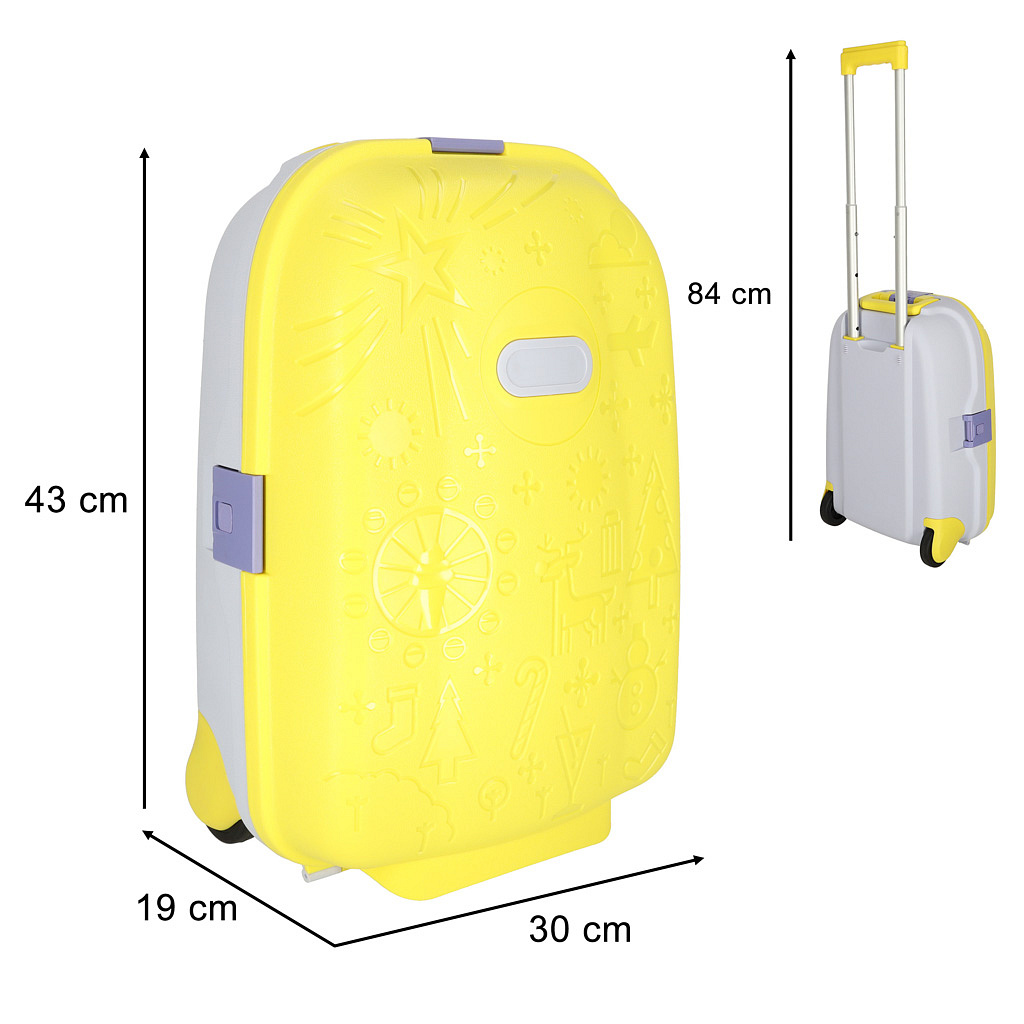 Vlastní kufr je ideálním řešením pro každého malého cestovatele připraveného na nová dobrodružství! Žlutá barva a zajímavé vzory upoutají pozornost dítěte a možná ho dokonce povzbudí k samostatnému sbalení. V sadě navíc samolepky umožňující označení zavazadla.