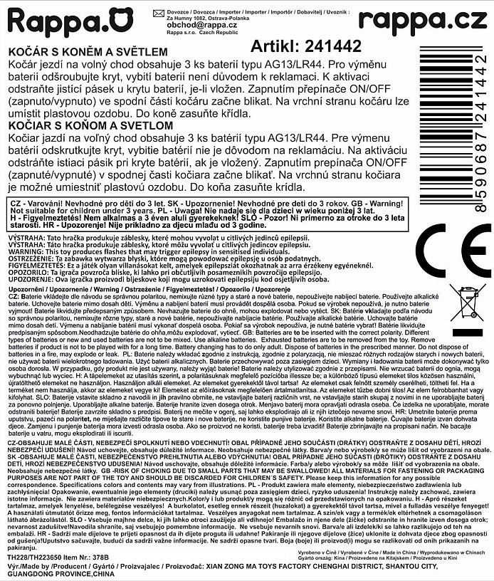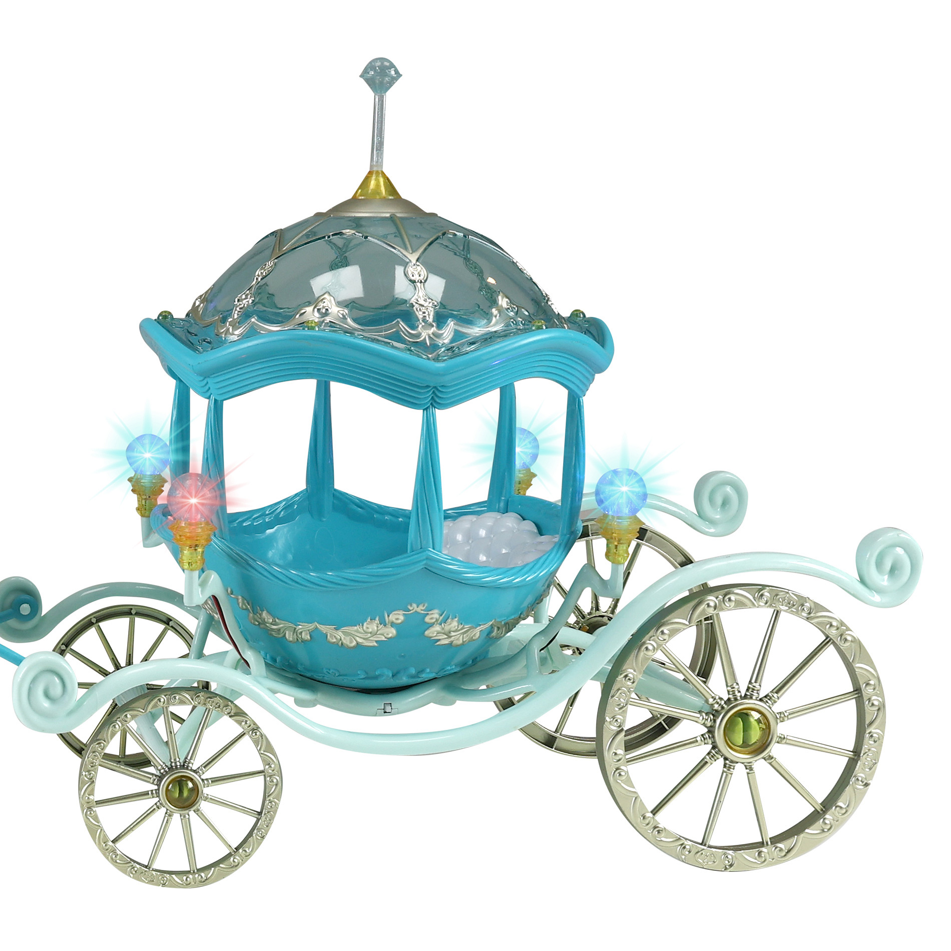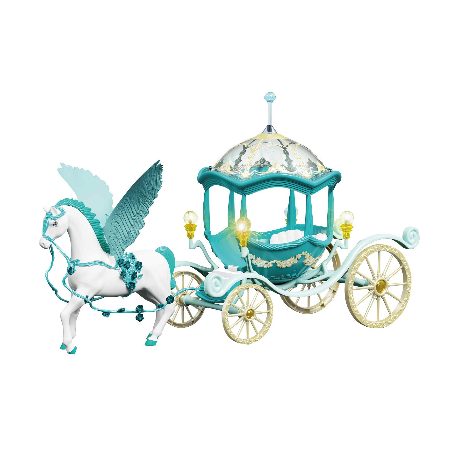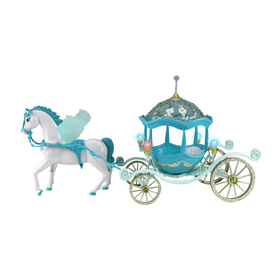 Bílý kůň s křídly zapřáhnutý do pohádkového kočáru. Každá tvá panenka si bude přát vyrazit v něm na zámecký bál! U kočáru po spuštění blikají lampičky. K této funkci je nutné použítí 3x1.5V baterií typu AG13, které jsou součástí .Celková délka kočáru i s koníkem je cca 60 cm.