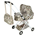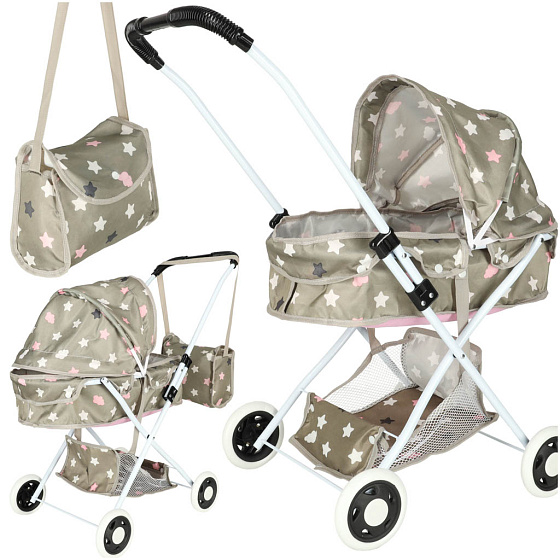 Tradiční kočárek umožňuje dítěti položit panenku do ležící polohy, přikrýt ji dečkou a starat se o ni jako o skutečné miminko. Kočárek pojme panenku o délce až 45 cm a bude vhodný pro procházky po domě nebo na dvorku. Dodatečně se dole nachází praktická polička na nejpotřebnější drobnosti a v sadě se také nachází praktická taška přes rameno. To je skvělá nabídka pro děti, které sní o svém prvním kočárku na hraní - pohodlném, prostorném a multifunkčním.