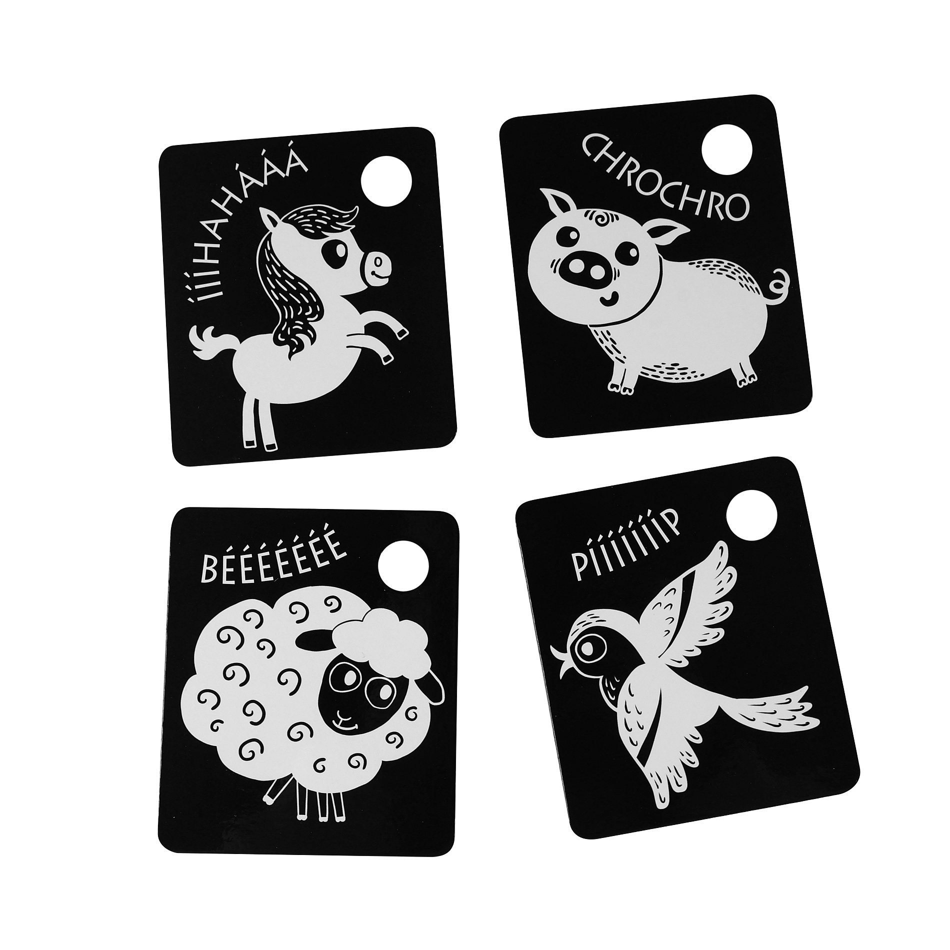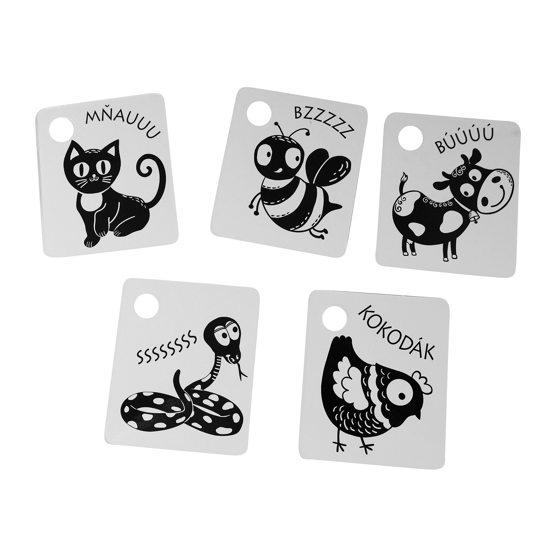 Kartičky jsou baleny po 9 kusech, vyrobeny z českých materiálů. V každé kartičce je otvor pro zavěšení. Součástí balení je plastový kroužek. Tyto kartičky zvyšují schopnost a podněcují dětskou přirozenou zvídavost, rozvíjejí dětskou motoriku, poznávání zvířátek.