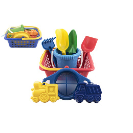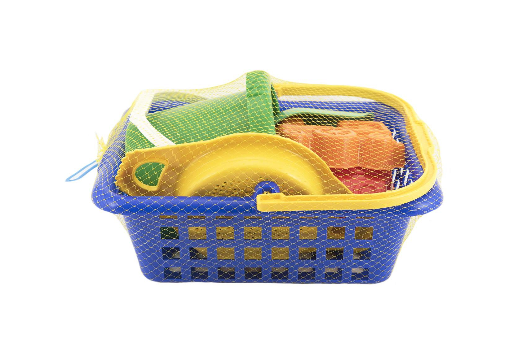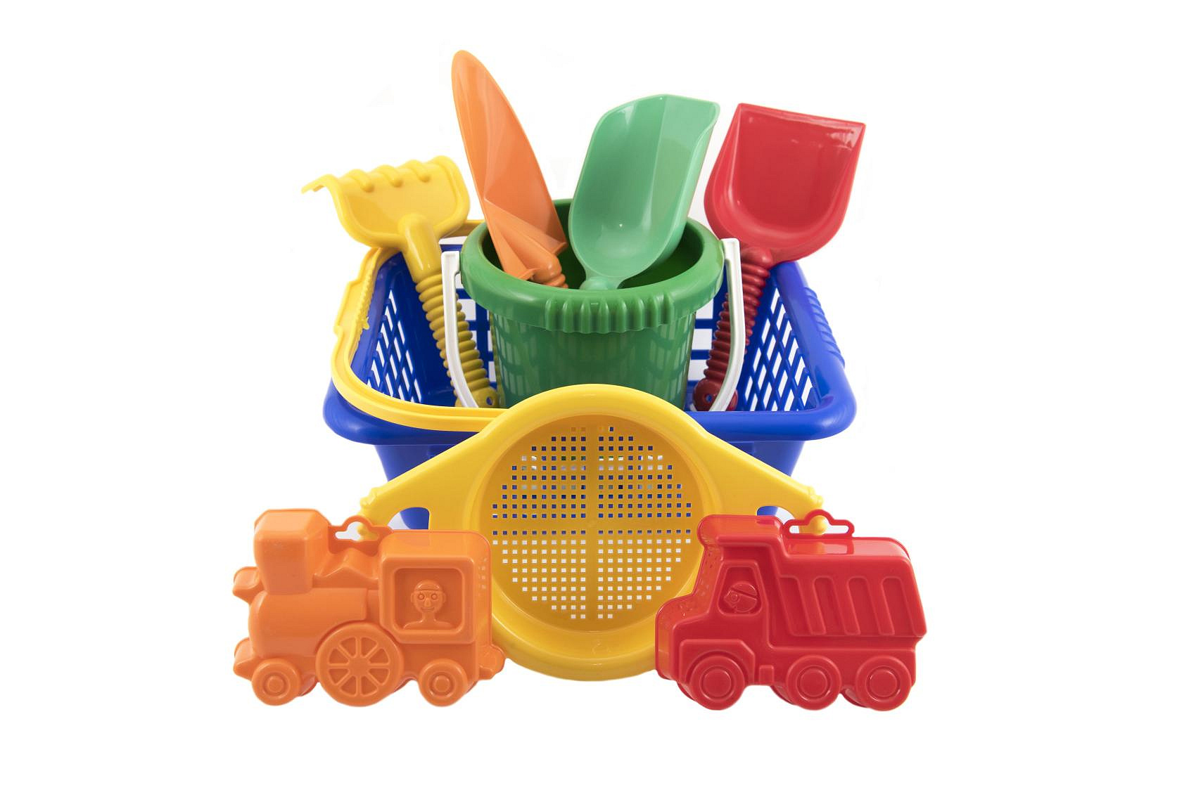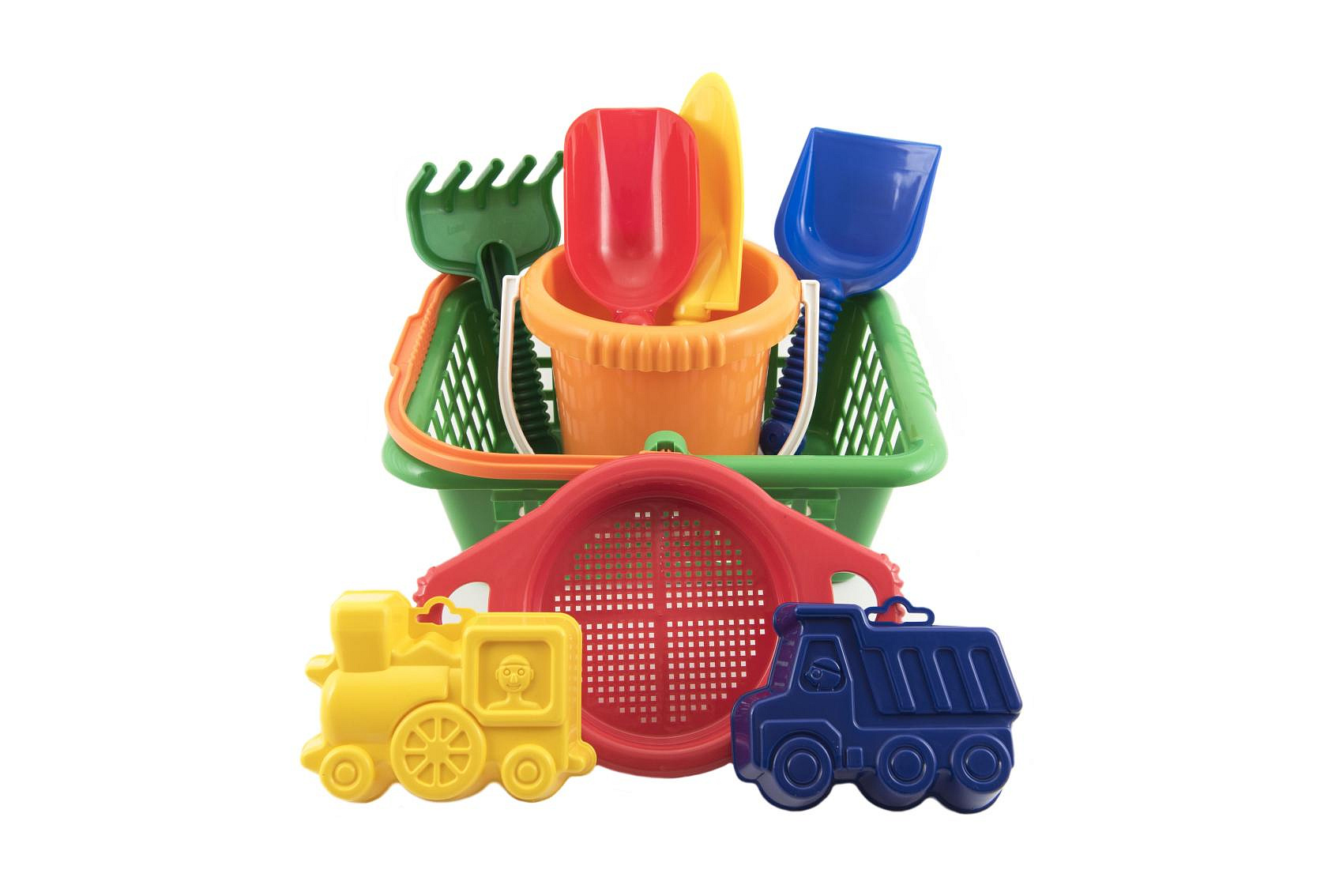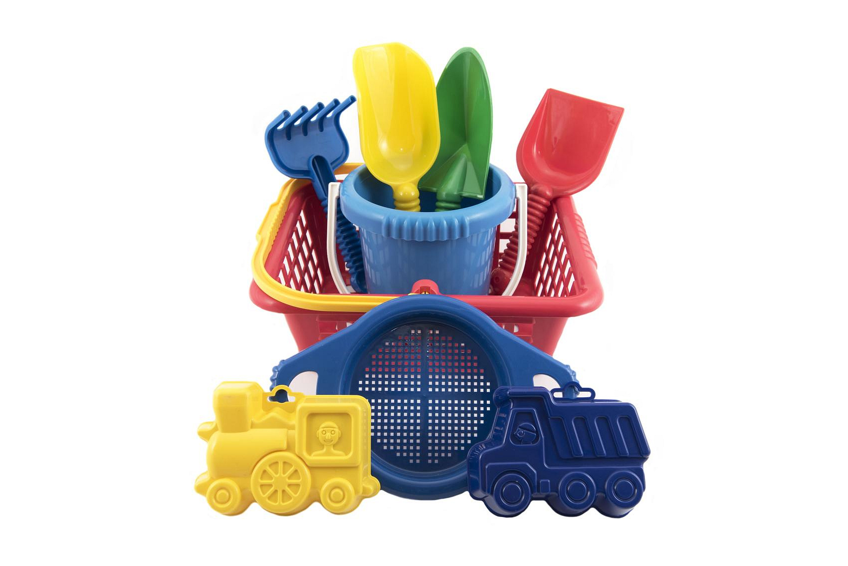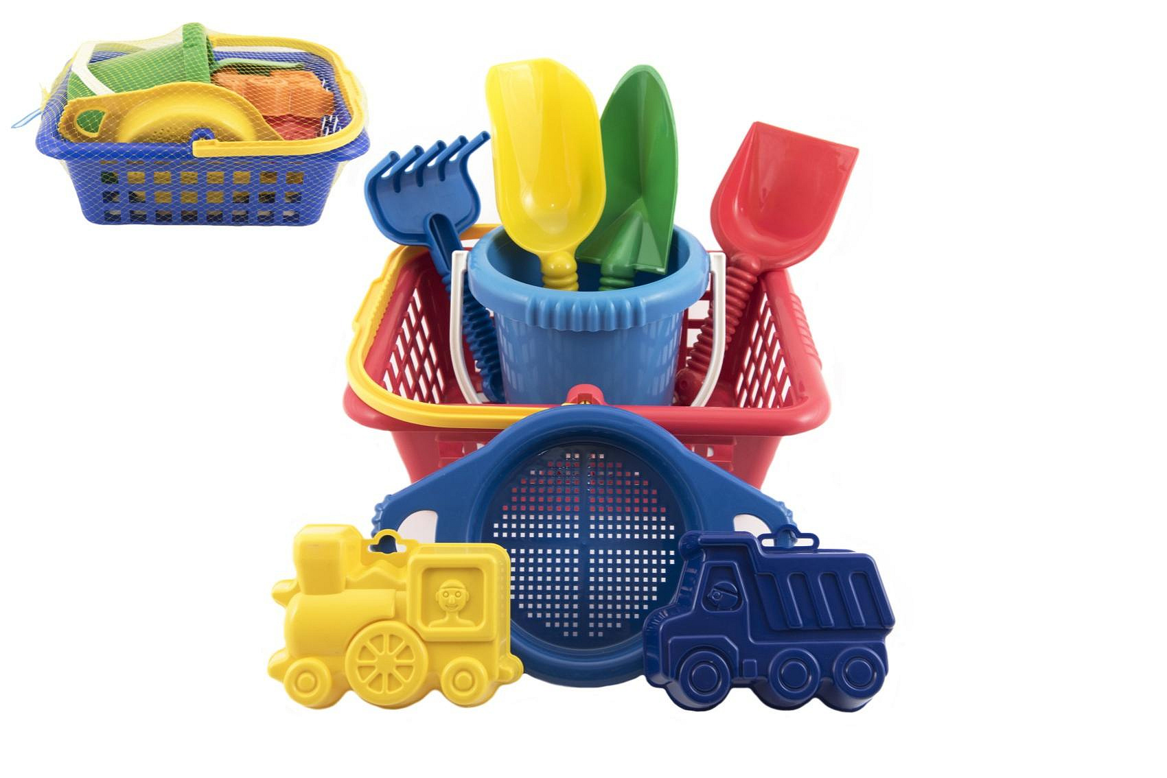 Košík sada - 2 bábovky rýč lopatka hrabičky sítko kbelík nákupní košík plast 12m+