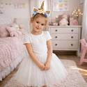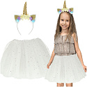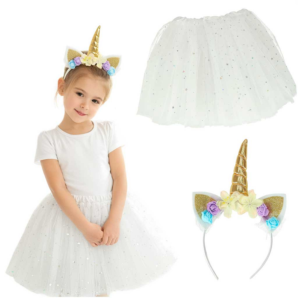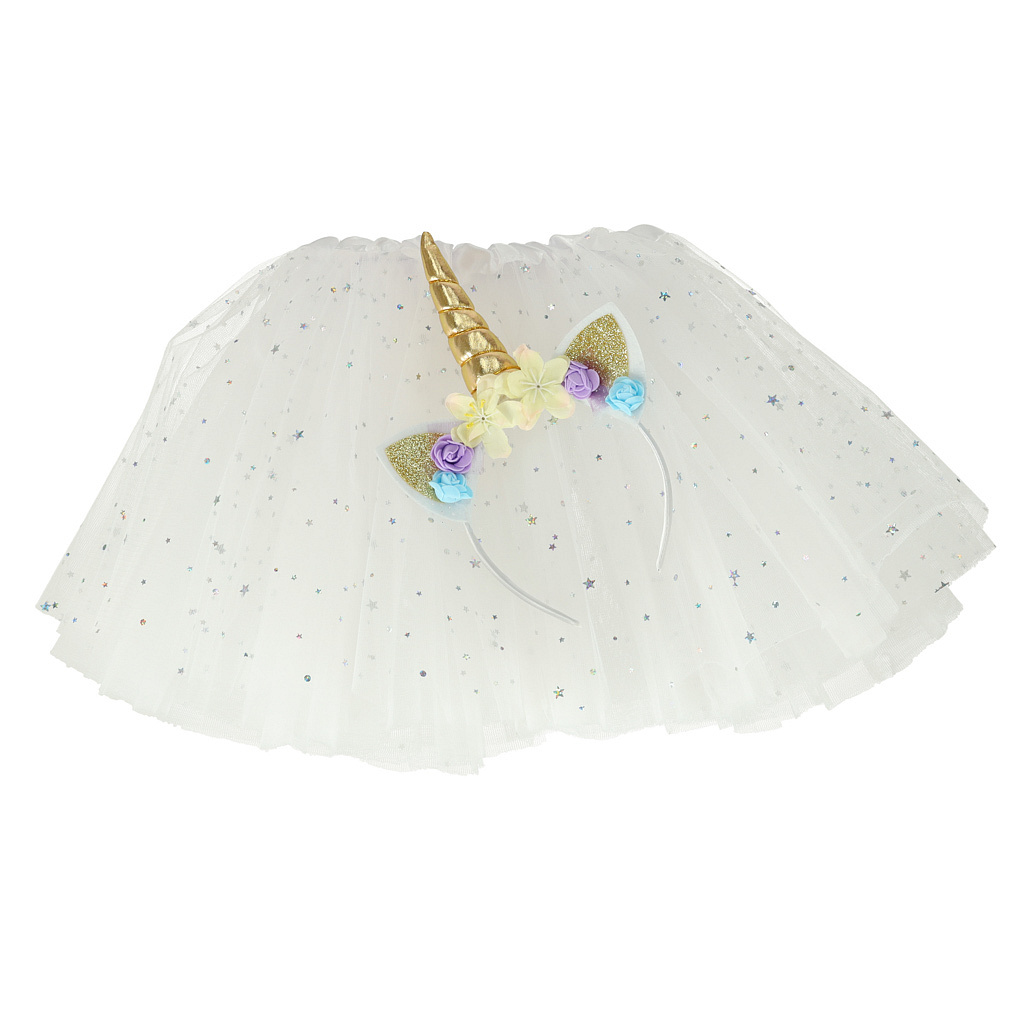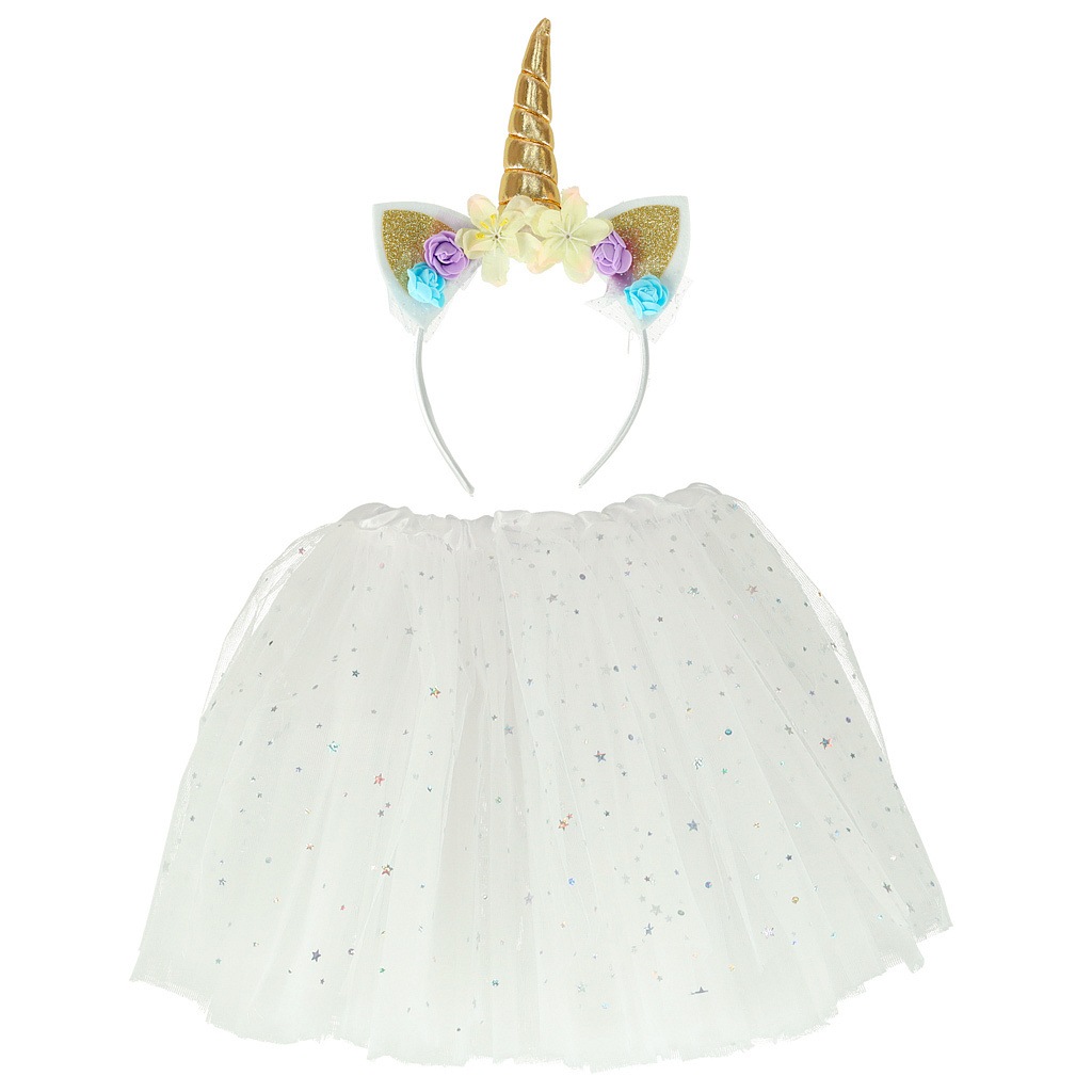 Strój karnawałowy opaska jednorożca i biała spódniczka księżniczki pokryta błyszczącymi gwiazdkami.