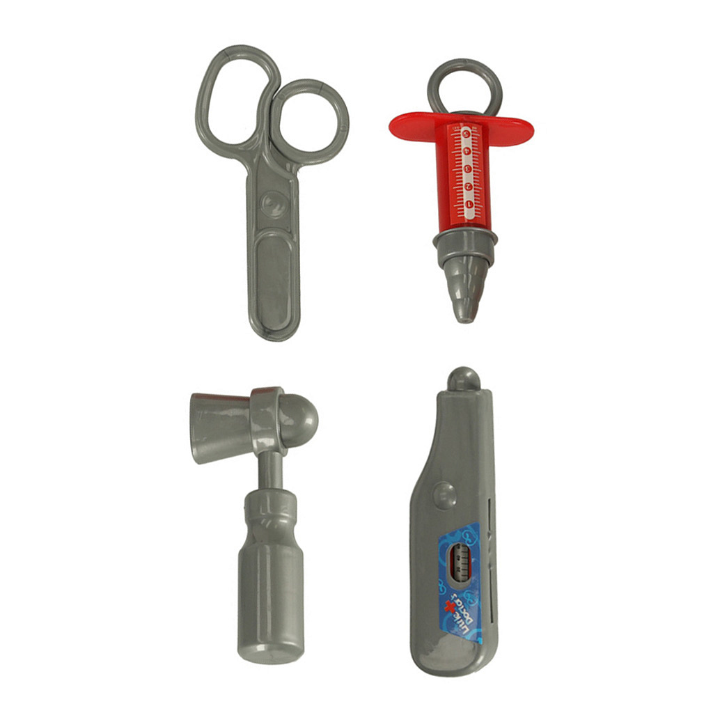 • Akcesoria do stroju lekarza - stetoskop, strzykawka, nożyczki, termometr i młoteczek - zaprojektowane w atrakcyjnej, dziecięcej odsłonie, by pobudzać wyobraźnię i urozmaicać zabawę